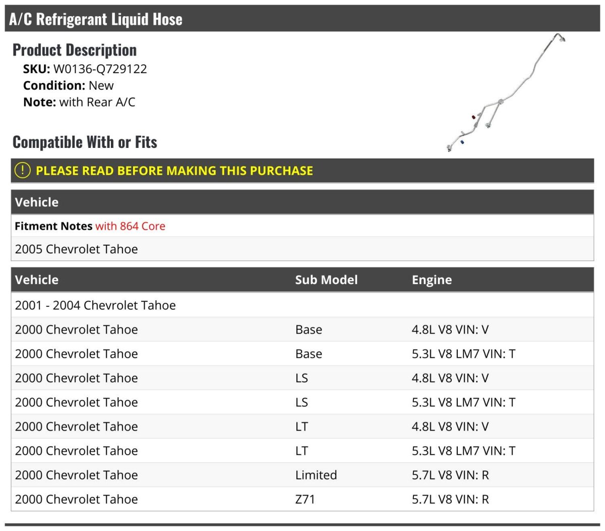 With Rear A/C. Compatible with or fits: (Note: with 864 Core; 2005 Chevy Tahoe) (2001 - 2004 Chevy Tahoe 2000 Chevy Tahoe Base 4.8L V8 VIN: V 2000 Chevy Tahoe Base 5.3L V8 LM7 VIN: T 2000 Chevy Tahoe LS 4.8L V8 VIN: V 2000 Chevy Tahoe LS 5.3L V8 LM7 VIN: T 2000 Chevy Tahoe LT 4.8L V8 VIN: V 2000 Chevy Tahoe LT 5.3L V8 LM7 VIN: T 2000 Chevy Tahoe Limited 5.7L V8 VIN: R 2000 Chevy Tahoe Z71 5.7L V8 VIN: R). A/C Liquid Hose. Review Description to Ensure Proper Fit.Other fine products