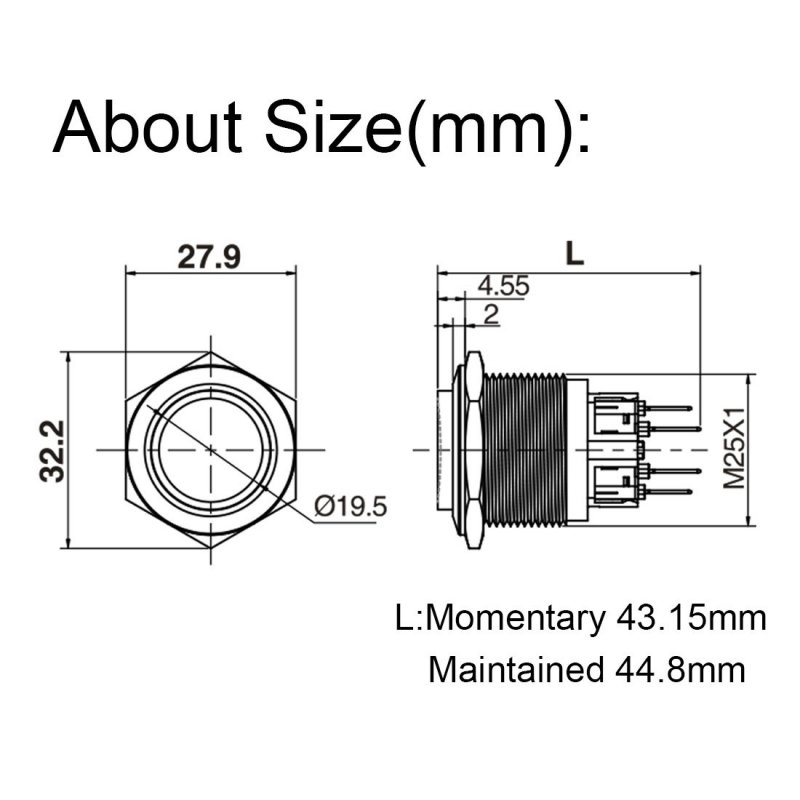 Oeperation Type: Momentary; Contact Type: 1NO+1NC; Current: 5A; Voltage: AC 250V;Install Style: PCB Type. Product Material: Stainless Steel, Electric Parts; Net Weight: 48g; Total Size: 44 x 32mm/1.73" x 1.25"(L*Max.D). Main Color: Silver Tone; Cap Type: High Round; Terminal Quantity: 4; Thread Diameter: 25mm. Operating Temperature: -25C to +55C; Operating Humidity: 45 to 85%RH;Protection Rating: IP67. Contact Resistance: 50Mohm Maximum; Insulation Resistance: 100Mohm Minimum;Package Content: 1 x Push Button Switch.
