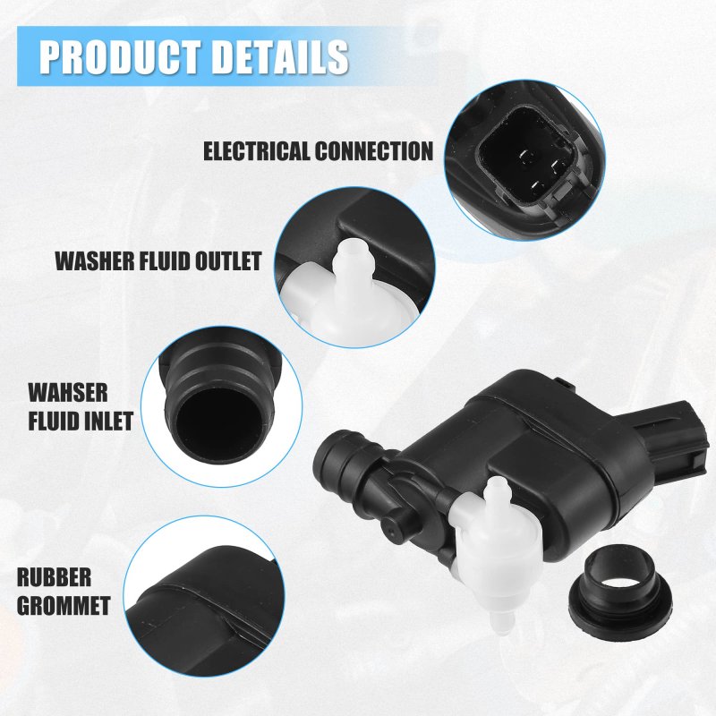 Fit for: for Hyundai Elantra GT 2018-2020, for Hyundai Santa Fe 2017-2022, for Hyundai Santa Fe Sport 2013-2018, for Hyundai Santa Fe XL 2019, for Hyundai Veloster 2016-2017, for Kia Seltos 2021-2023, for Kia Sportage 2017-2020, for Kia Telluride 2020-2022.. OE Number : 98510-2W500. Good Replacement - To replace your Windshield Washer Pump if its broken, cracked, clogged beyond repair, or wont stay aimed correctly.. Easy Installation - Direct replacement, no need to make any changes, match the original.. Package Includes: 1 Pcs Windshield Washer Pump, 1 Pcs Rubber Grommet..