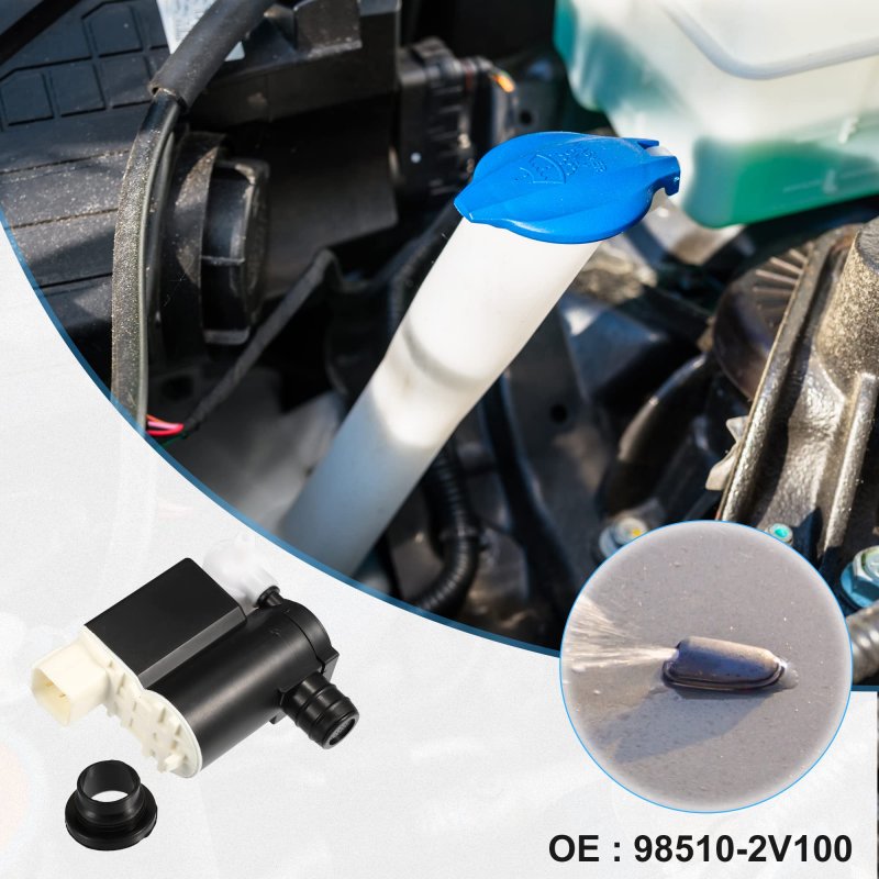 Fit for: for Hyundai Santa Fe 2013-2018, for Hyundai Veloster 2012-2017, for Hyundai Veracruz 2007-2012, for Hyundai Entourage 2007-2008. OE Number: 98510-2V100. Car windshield washer pumps fluid from the washer fluid reservoir, through the washer nozzle, onto your windshield to help wash away dirt.. Made from metal, plastic material for strong strength and long durability.. Package Includes: 1 Pcs Windshield Washer Pump, 1 Pcs Grommet.Other fine products