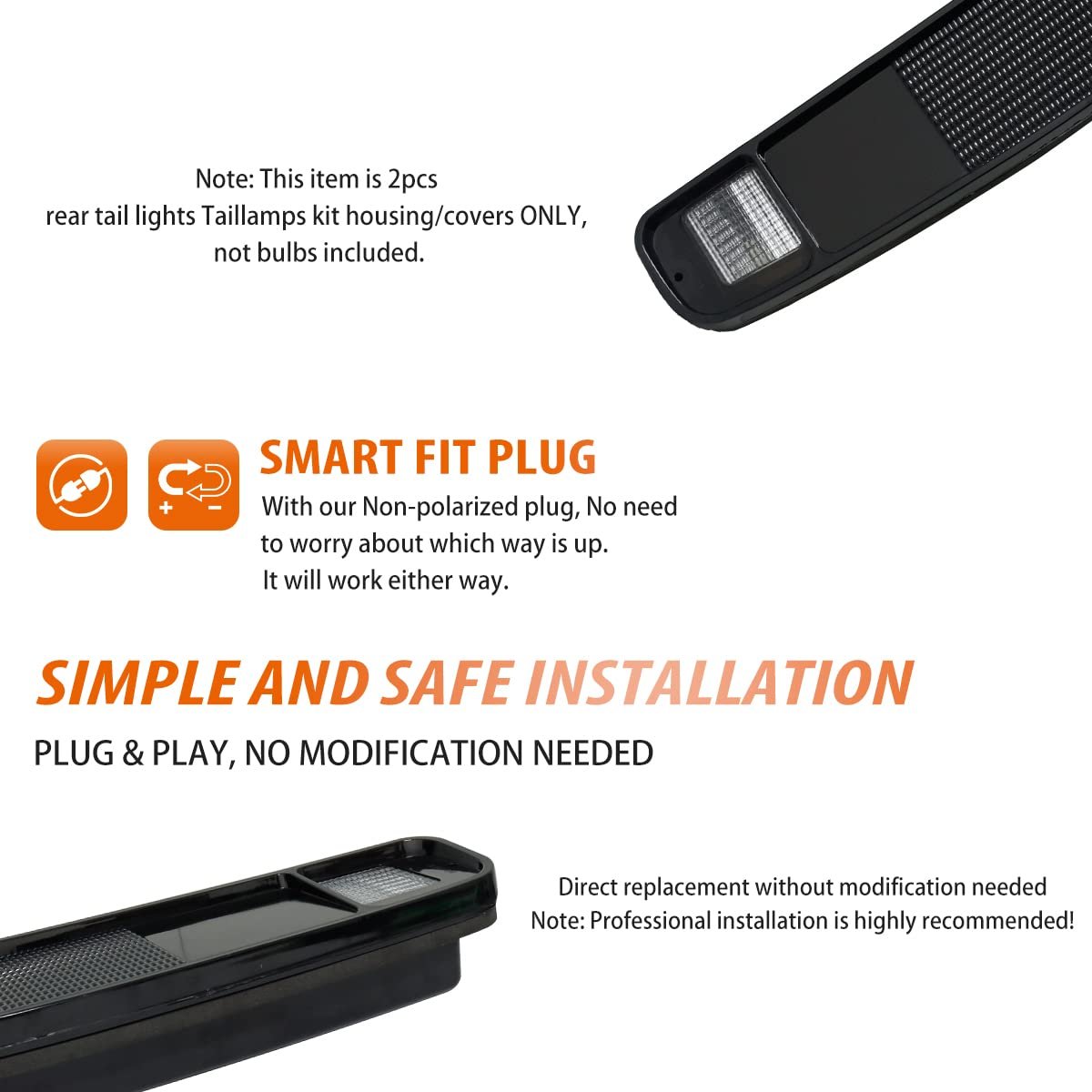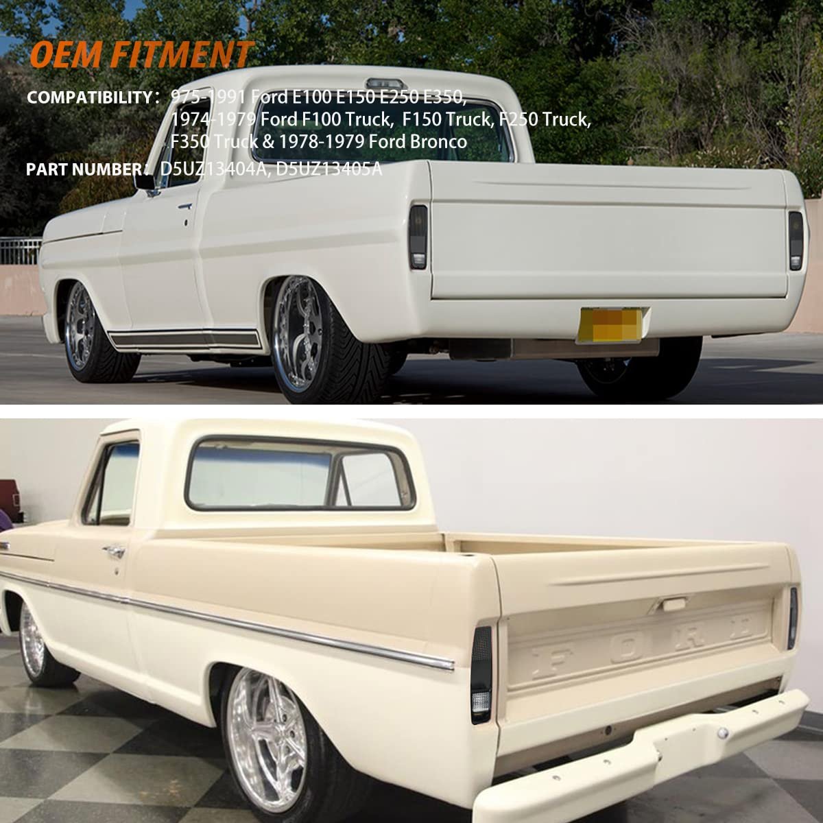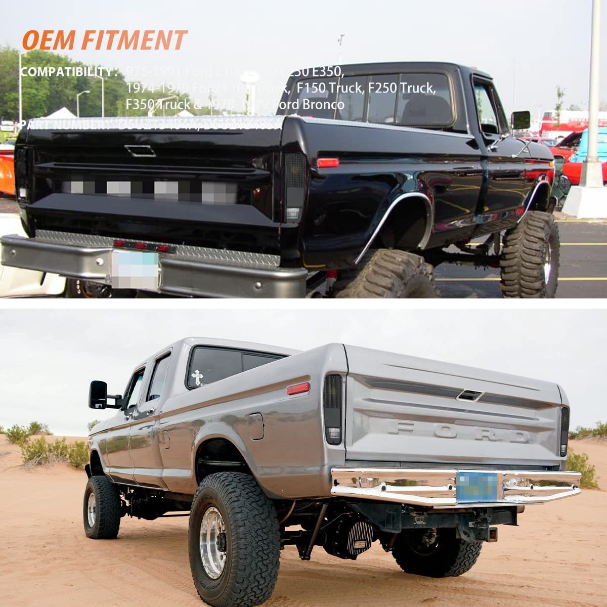 COMPATIBLE WITH:1978-1979 Ford Bronco, 1975-1991 Ford E100 E150 E250 E350 & 1974-1979 Ford F100 Truck, F150 Truck, F250 Truck, F350 Truck ;Replace OEM Number: D5UZ13404A, D5UZ13405A;Replaces partslink number: FO2800101, FO2801101. :1Pair (2 Pieces) OE-Style Smoked Lens Rear Tail Lights Taillamps Housing Kit,Note: This item is 2pcs rear tail lights Taillamps kit housing/covers ONLY, not bulbs included.. Installation:Each piece is easy to install with an OEM fit, perfect for replacement or repair.Direct replacement, plug and play with no modification needed.. Waterproof:These rear tail lights Taillamps housings are a great way to upgrade your Truck with a great looks.Waterproof IP67, shockproof, dustproof..Other fine products