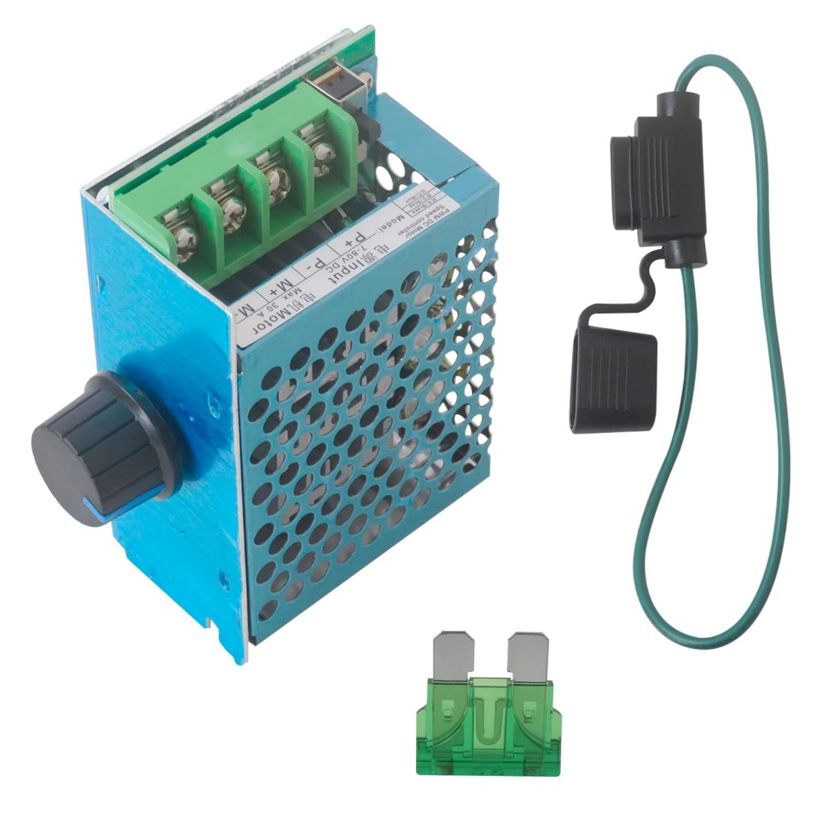 Xspeedonline Adjustable DC Motor Speed Regulator PWM 7-70V 30A 500W for Power Tools. Wide Voltage Compatibility - Supports 7-70V DC input with 30A maximum current capacity, suitable for various DC brush motor applications from low to high voltage systems.. Smooth Speed Regulation - Features 12kHz PWM frequency and 1%-100% duty cycle adjustment range, providing smooth motor control without stuttering, vibration, or buzzing noise.. Multiple Control Functions - Integrated run, stop, and brake functions with separate potentiometer for flexible speed adjustment, featuring 15cm wire length for convenient installation.. Robust Power Handling - Rated for 500W maximum output power with specific ratings of 250W at 12V, 350W at 24V, 450W at 48V, and 400W at 60V for reliable performance..Other fine products