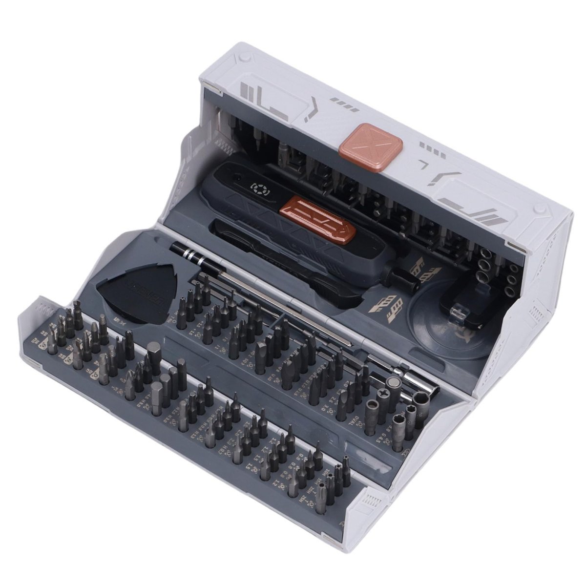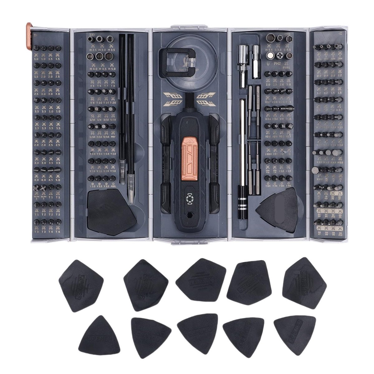 [High Versatility] Equipped with 160 bits, including long bits for deep hole applications, this kit meets the diverse needs of professionals in electronic repair.. [Ergonomic Design] The ratchet with a soft rubber grip and ergonomic design provides a comfortable hold, with a ratchet switch for easy tightening and loosening of screws.. [Long-lasting Durability] The crv steel bits with a phosphated finish ensure longevity and accuracy, while the abs plastic storage box keeps everything secure.. [Adjustable and Stable Torque] This set features easily adjustable torsion with stable output, making it for tasks involving pcs, laptops, smartphones, and other electronic devices.. [Enhanced Usability] Integrated magnetizer for immediate magnetization of bits, magnetic pads for easy screw tracking, and metal tweezers for prying and handling microelectronic components ensure accuracy in every task..Other fine products