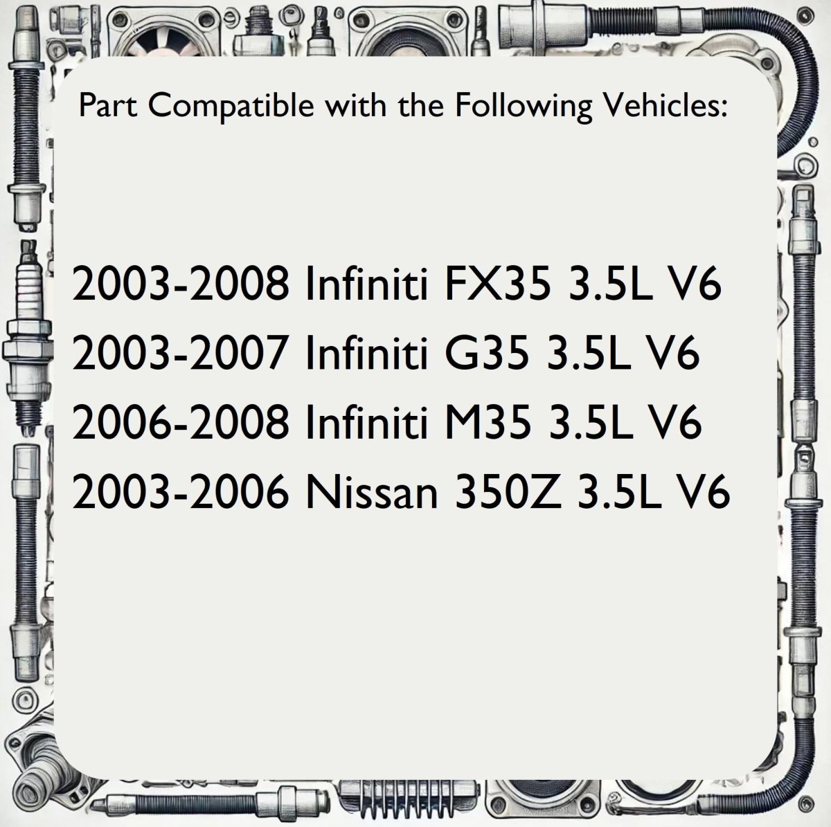UP TO 15% MORE IGNITION POWER - OEM-GRADE DURABILITY. DIRECT OEM REPLACEMENT - PLUG AND PLAY INSTALLATION. COMPATIBLE WITH 2003-2008 Infiniti FX35, G35, M35 & Nissan 350Z 3.5L V6 22448AL61C **Be Sure to Check for Correct Fitment using the Vehicle Chart on this page.. QUICK SPECS - Performance Quality Polymers, Longer Service Life, Exceptional Resistance to Heat, Thoroughly tested and verified for extreme durability, Factory OE mounting points and connections, Stable Operation from -40F to 500F. WHAT'S INCLUDED - 6pc Ignition Coil Set, 6pc Iridium Spark Plug Set (As Pictured).Other fine products