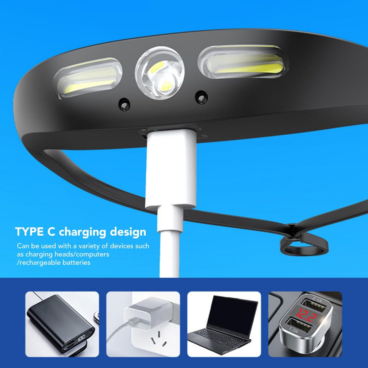 TYPE C POWER SUPPLY: Head flashlight using Type C mode power supply, positive and negative can be plugged, strong applicability, can use the charging head, computer, power bank and other devices charging.. WITH LOCKING BUCKLE: Camping headlamps are made of silicone, bend resistant, with locking buckle, to adjust the tightness, widely used in miners, maintenance, running, outdoor, etc.. DUAL LIGHT SOURCE: Headlamp adopts dual light source wick design, XPG and COB light source, 1 main light and 2 auxiliary lights dual light source design, to meet your different light needs.. FIVE LIGHT MODES: XPG strong light, COB strong light, XPG and COB strong light, XPG and COB low light, XPG and COB flashing, easily cope with the complex and changing outdoor environment.. INFRARED INDUCTION: Motion sensor head lamp using infrared sensor device, waving the hand to control the head lamp switch..Other fine products