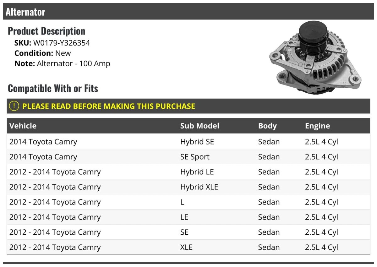 Compatible with or fits: 2014 Toyota Camry Hybrid SE Sedan 2.5L 4 Cyl 2014 Toyota Camry SE Sport Sedan 2.5L 4 Cyl. Compatible with or fits: 2012 - 2014 Toyota Camry Hybrid LE Sedan 2.5L 4 Cyl 2012 - 2014 Toyota Camry Hybrid XLE Sedan 2.5L 4 Cyl. Compatible with or fits: 2012 - 2014 Toyota Camry L Sedan 2.5L 4 Cyl 2012 - 2014 Toyota Camry LE Sedan 2.5L 4 Cyl. Compatible with or fits: 2012 - 2014 Toyota Camry SE Sedan 2.5L 4 Cyl 2012 - 2014 Toyota Camry XLE Sedan 2.5L 4 Cyl. Alternator - 100 Amp.Other fine products