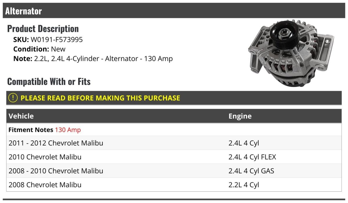 Compatible with or fits: (Note: 130 Amp) 2011 - 2012 Chevy Malibu 2.4L 4 Cyl. Compatible with or fits: (Note: 130 Amp) 2010 Chevy Malibu 2.4L 4 Cyl Flex. Compatible with or fits: (Note: 130 Amp) 2008 - 2010 Chevy Malibu 2.4L 4 Cyl Gas. Compatible with or fits: (Note: 130 Amp) 2008 Chevy Malibu 2.2L 4 Cyl. Review Description to Ensure Proper Fit.