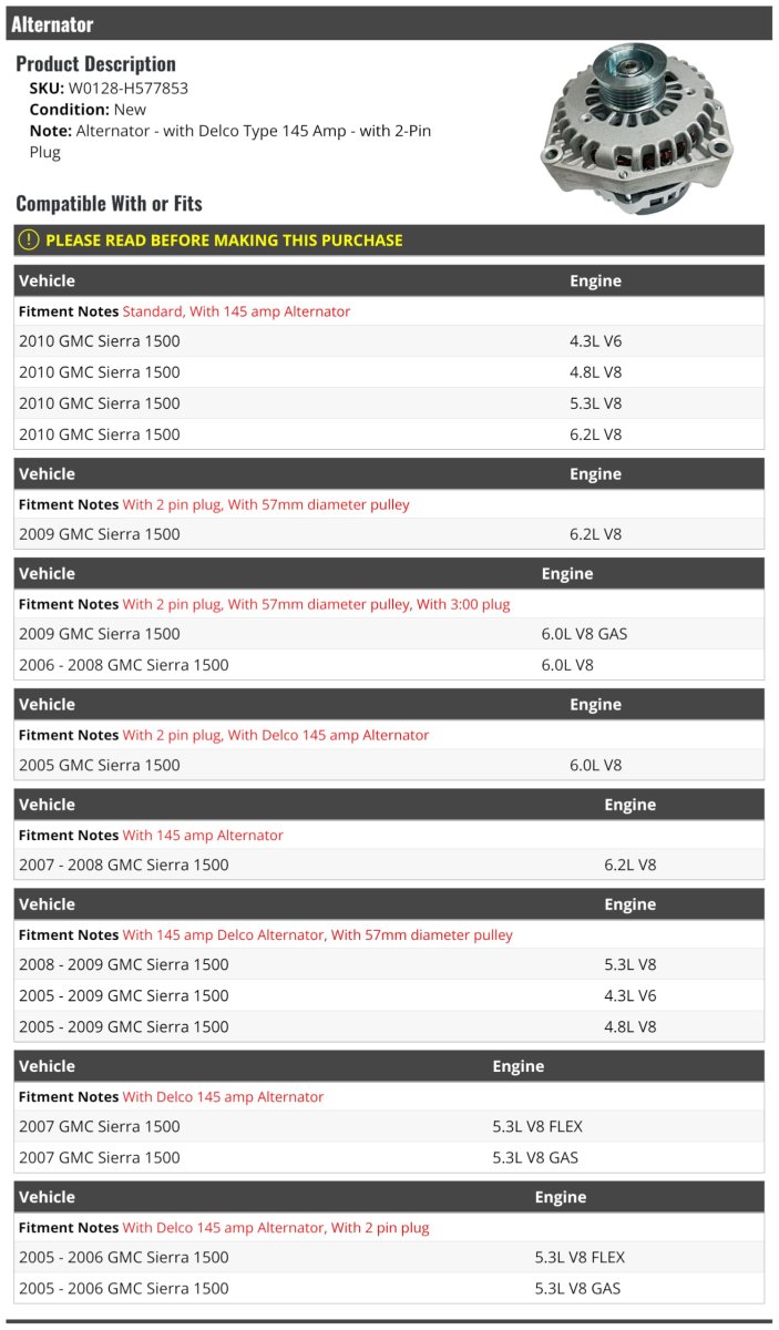 Alternator - with D.e.l.c.o Type 145 Amp - with 2-Pin Plug. Compatible with or fits: (Note: Standard, With 145 amp Alternator; 2010 GMC Sierra 1500 4.3L V6 2010 GMC Sierra 1500 4.8L V8 2010 GMC Sierra 1500 5.3L V8 2010 GMC Sierra 1500 6.2L V8). Compatible with or fits: (Note: With 2 pin plug, With 57mm diameter pulley; 2009 GMC Sierra 1500 6.2L V8) (Note: With 2 pin plug, With 57mm diameter pulley, With 3:00pm plug; 2009 GMC Sierra 1500 6.0L V8 GAS 2006 - 2008 GMC Sierra 1500 6.0L V8) (Note: With 2 pin plug, With D.e.l.c.o 145 amp Alternator; 2005 GMC Sierra 1500 6.0L V8). Compatible with or fits: (Note: With 145 amp Alternator; 2007 - 2008 GMC Sierra 1500 6.2L V8) (Note: With 145 amp D.e.l.c.o Alternator, With 57mm diameter pulley; 2008 - 2009 GMC Sierra 1500 5.3L V8 2005 - 2009 GMC Sierra 1500 4.3L V6 2005 - 2009 GMC Sierra 1500 4.8L V8) (Note: With D.e.l.c.o 145 amp Alternator; 2007 GMC Sierra 1500 5.3L V8 FLEX 2007 GMC Sierra 1500 5.3L V8 GAS). Compatible with or fits: Note: With D.e.l.c.o 145 amp Alternator, With 2 pin plug; 2005 - 2006 GMC Sierra 1500 5.3L V8 FLEX 2005 - 2006 GMC Sierra 1500 5.3L V8 GAS.Other fine products