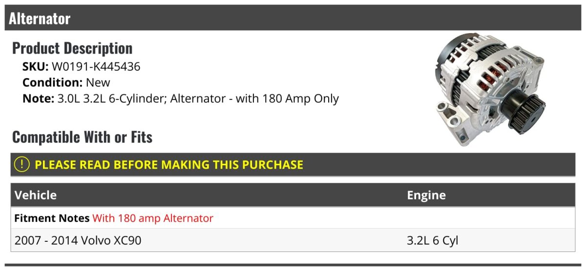 - Alternator For 2007-2014 Volvo Xc90 3 2l 6-cylinder With 180 Amp