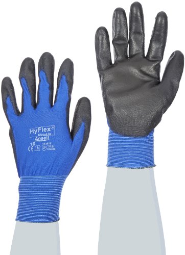 Ansell Pro HyFlex light duty multi purpose Glove. Experience the optimum balance of protection, comfort and dexterity with HyFlex gloves. Ergonomically designed, they blend quality performance with precision handling. Made of lightest blue nylon lined and coated HyFlex glove for outstanding comfort and sensitivity. Dark liner and glove mask dirt and reduce glove waste. Palm is coated with black polyurethane. Enhanced flexibility, tactility, and handling efficiency. High abrasion resistance extends glove life. Smooth finish/texture. Ideal for workers who need a high level of touch and precision. ANSI Level 1 Cut; ANSI Abrasion 2500 cycles (ANSI Level 3) 500g load. Elasticized Knitwrist. Best for picking and fitting small pieces. Use in finishing works, automotive and automotive OEM, electrical machinery. Size 10. Ideal for construction, energy, manufacturing and other occupations. Model # 11-618-288601 Features: Made of light duty dark blue nylon liner Palm is coated with black polyurethane Smooth finish/texture ANSI level 1 cut; ANSI abrasion 2500 cycles (ANSI Level 3) 500g load Elasticized Knitwrist.Other fine products