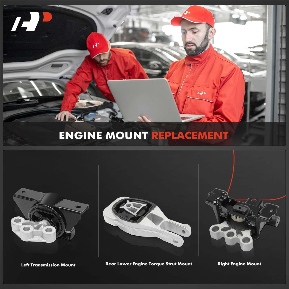 [Vehicle Fitment]: Compatible with Chevrolet Sonic 2019 L4 1.4L, Sonic 2014-2017 L4 1.6L/L4 1.8L, Sonic 2018 L4 1.8L --- It only fits for Manual Transmission, not Automatic Transmission. [Reference Number]: A62038, A5922, A5726, EM-9498, 95350019, 95493722, 96852632, 3470, 3442, 3293, EM9498. [Package Included]: 1 x Right Engine Mount -- with Soft Ride, 1 x Left Transmission Mount, 1 x Rear Lower Engine Torque Strut Mount. [Advantages]: A-Premium engine mount set supports the engine, absorbs vibrations and reduces noise effectively for a smoother and more comfortable driving. Made of outstanding materials, designed for the precise fit and long-lasting performance..