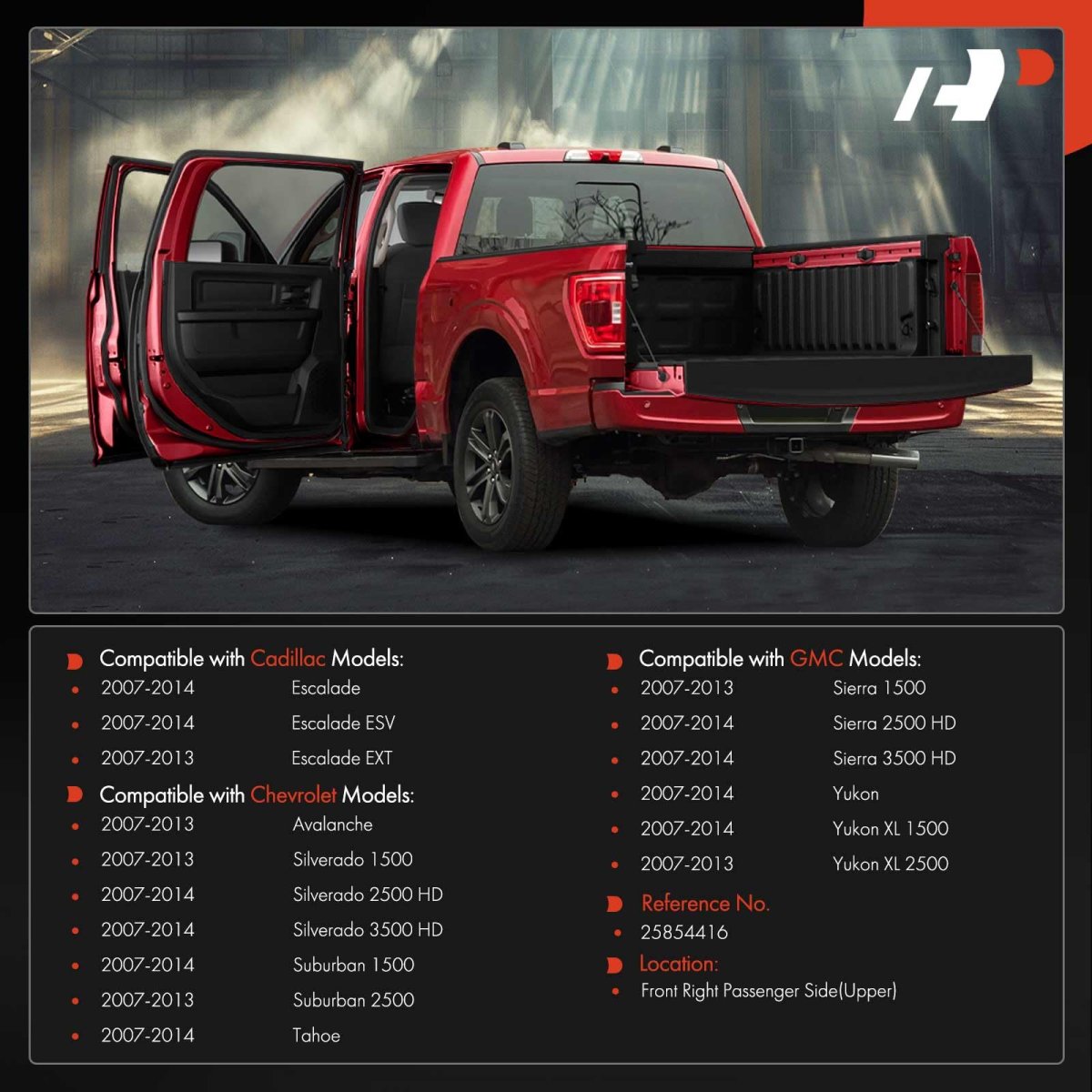 [Vehicle Fitment]: Compatible with Cadillac Escalade 2007-2014, Escalade ESV 2007-2014, Escalade EXT 2007-2013; Compatible with Chevrolet Avalanche 2007-2013, Silverado 1500 2007-2013, Silverado 2500 HD 2007-2014, Silverado 3500 HD 2007-2014, Suburban 1500 2007-2014, Suburban 2500 2007-2013, Tahoe 2007-2014; Compatible with GMC Sierra 1500 2007-2013, Sierra 2500 HD 2007-2014, Sierra 3500 HD 2007-2014, Yukon 2007-2014, Yukon XL 1500 2007-2014, Yukon XL 2500 2007-2013. [Location]: Front Right Passenger Upper Side. [Product Features]: The door hinge is a device that determines the relative position of the car door and the car body, and can control the movement trajectory of the door, A-Premium door hinge is made of good metal materials, and its surface is treated with rust and corrosion prevention technology to improve oxidation resistance and deformation resistance, ensuring the durability and stability of the product.