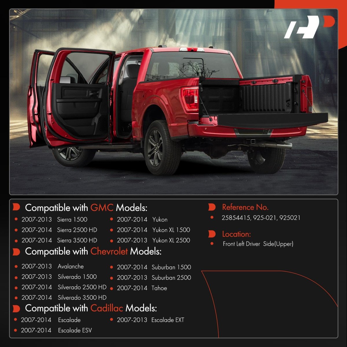 [Vehicle Fitment]: Compatible with Cadillac Escalade 2007-2014, Escalade ESV 2007-2014, Escalade EXT 2007-2013; Compatible with Chevrolet Avalanche 2007-2013, Silverado 1500 2007-2013, Silverado 2500 HD 2007-2014, Silverado 3500 HD 2007-2014, Suburban 1500 2007-2014, Suburban 2500 2007-2013, Tahoe 2007-2014; Compatible with GMC Sierra 1500 2007-2013, Sierra 2500 HD 2007-2014, Sierra 3500 HD 2007-2014, Yukon 2007-2014, Yukon XL 1500 2007-2014, Yukon XL 2500 2007-2013. [Location]: Front Left Driver Upper Side. [Product Features]: The door hinge is a device that determines the relative position of the car door and the car body, and can control the movement trajectory of the door, A-Premium door hinge is made of good metal materials, and its surface is treated with rust and corrosion prevention technology to improve oxidation resistance and deformation resistance, ensuring the durability and stability of the product.Other fine products