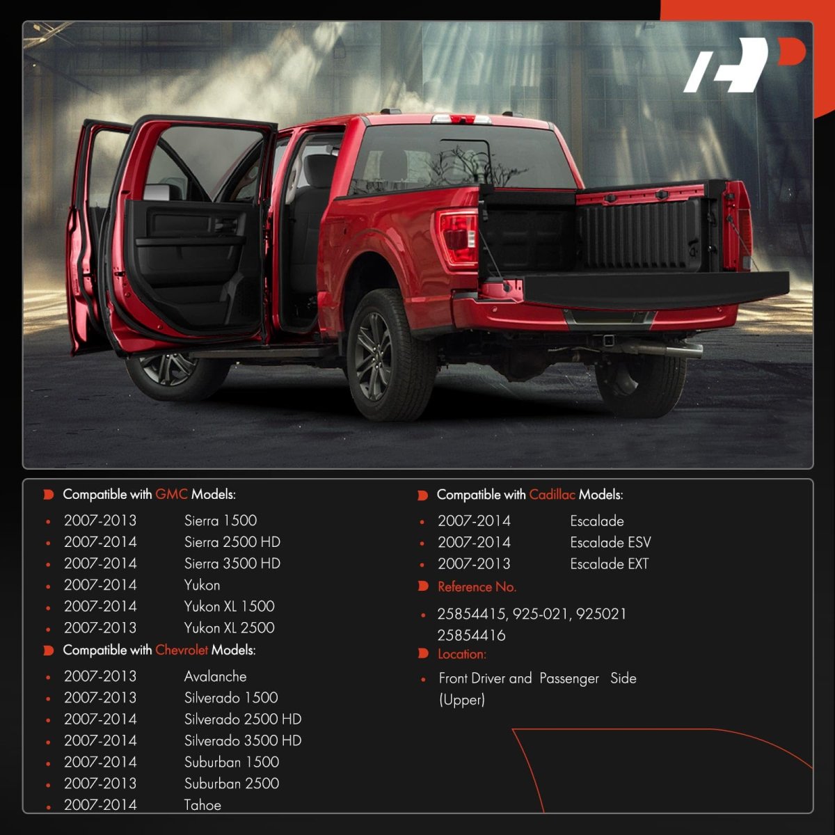 [Vehicle Fitment]: Compatible with Chevrolet Silverado 1500 2007-2013, Silverado 2500 HD 2007-2014, Silverado 3500 HD 2007-2014, Tahoe 2007-2014, Suburban 1500 2007-2014, Suburban 2500 2007-2013, Avalanche 2007-2013; Compatible with GMC Sierra 1500 2007-2013, Sierra 2500 HD 2007-2014, Sierra 3500 HD 2007-2014, Yukon 2007-2014, Yukon XL 1500 2007-2014, Yukon XL 2500 2007-2013; Compatible with Cadillac Escalade 2007-2014, Escalade ESV 2007-2014, Escalade EXT 2007-2013. [Location]: Front Driver and Passenger Upper Side. [Product Features]: The door hinge is a device that determines the relative position of the car door and the car body, and can control the movement trajectory of the door, A-Premium door hinge is made of good metal materials, and its surface is treated with rust and corrosion prevention technology to improve oxidation resistance and deformation resistance, ensuring the durability and stability of the product.