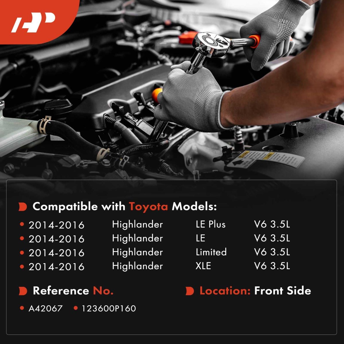 [Vehicle Fitment]: Compatible with Toyota Highlander 2014 2015 2016 V6 3.5L. [Reference Number]: A42067, 123600P160. [Specifications]: Location: Front Side; Type: Engine Motor Mount; Material: Aluminum, Steel, Rubber; Mounting Hole Quantity: 1; Stud Quantity: 3; Quantity Sold: One Piece. [Advantages]: A-Premium engine mount supports the engine, absorbs vibrations and reduces noise effectively for a smoother and more comfortable driving. Made of outstanding materials, designed for the precise fit and long-lasting performance.Other fine products