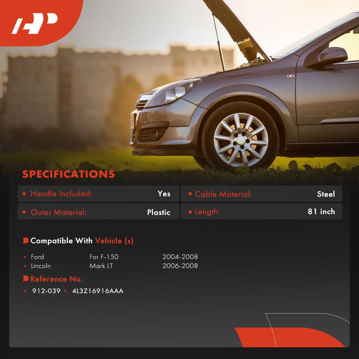 [Vehicle Fitment]: Compatible with Ford F-150 2004-2008; Compatible with Lincoln Mark LT 2006-2008 --- It comes with Dash to Latch. [Specification]: Location: Front Hood; Length: 81 inch; Handle Included: Yes; Material: Steel/Plastic. [Product Features]: The surface of the A-Premium hood latch release cable has undergone special plastic-coating treatment, which can improve corrosion resistance and enhance touch; The internal material of hood release cable is high density steel wire, which is not easy to break, making our hood support straps more sturdy; Hood release cable pull handle assembly restores the use and convenience of your vehicle's hood cover.Other fine products