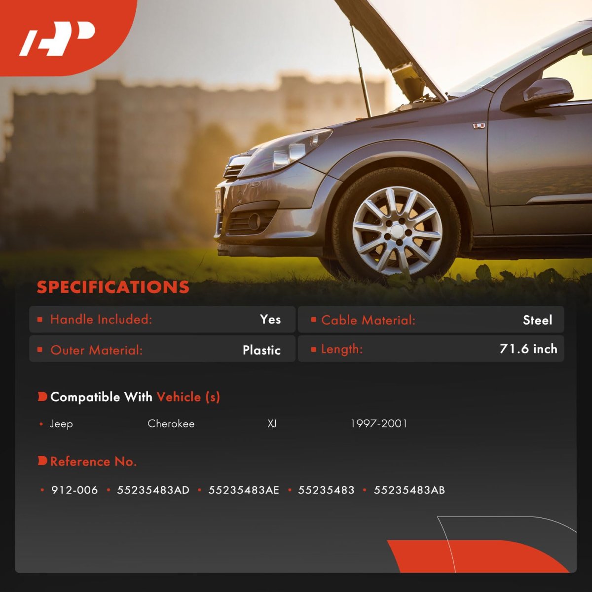[Vehicle Fitment]: Compatible with Jeep XJ Series Cherokee 1997-2001. [Specification]: Location: Front Hood; Length: 71.6 inch; Handle Included: Yes; Material: Steel/Plastic. [Product Features]: The surface of the A-Premium hood latch release cable has undergone special plastic-coating treatment, which can improve corrosion resistance and enhance touch; The internal material of hood release cable is high density steel wire, which is not easy to break, making our hood support straps more sturdy; Hood release cable pull handle assembly restores the use and convenience of your vehicle's hood cover.Other fine products