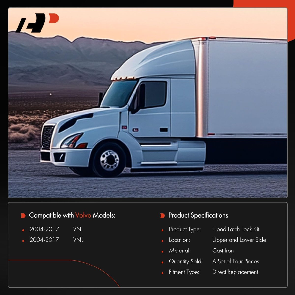 [Vehicle Fitment]: Compatible with 2004-2018 Volvo VNL Hood Latch, 2004-2018 Volvo VN Hood Latch. [Reference Number]: Upper Hood Latches: 20498998, 20878648, 20878651, 8074949, 82210369, 8081359, 8081393, 8081394, 8089035; Driver Side Lower Hood Lock: 3187264, 8074938, 8084222, 20356094, 20415174, 20565618; Passenger Side Lower Hood Lock: 3187265, 8074939, 8084223, 20356096, 20415175, 20565619. [Kit Parts Included]: 2x Upper Hood Latches; 1x Driver Left Side Lower Hood Latch; 1x Passenger Right Side Lower Hood Latch. [Material]: This Hood Release Latches are Made of Excellent Cast Iron Material, which improves the durability and reliability of the Volvo VNL/VN Accessories.Other fine products