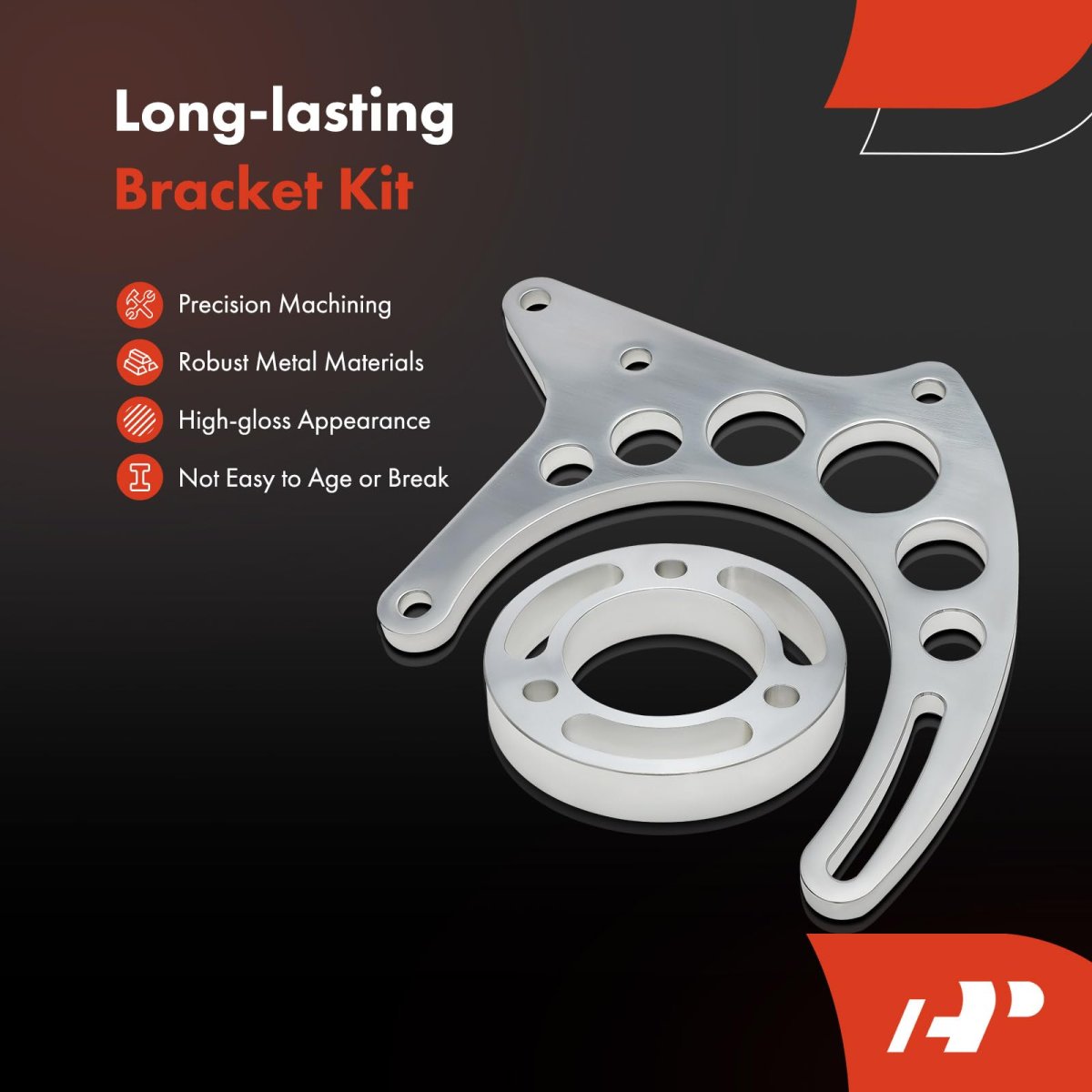 [Vehicle Fitment]: Compatible with Chevy Small Block Engines --- It Will Fit On Most 283 305 307 327 350 And 400 Engines. [Important Note]: Only fit Small Block with Long Water Pump; Bolts on to three water pump accessory holes and one head accessory hole; Crank pulley spacer included for correct alignment; Works with standard size alternators. [Specifications]: Color: Silver; Bracket Material: Aluminum; Bracket Finish: Polished; Location: Alternator; Condition: New. [Features]: The A-Premium alternator bracket kit is crafted from billet aluminum material, providing maximum strength and longevity for extended use. The polished finish enhances corrosion and rust resistance, giving it a bright appearance that adds a premium look to your engine..Other fine products