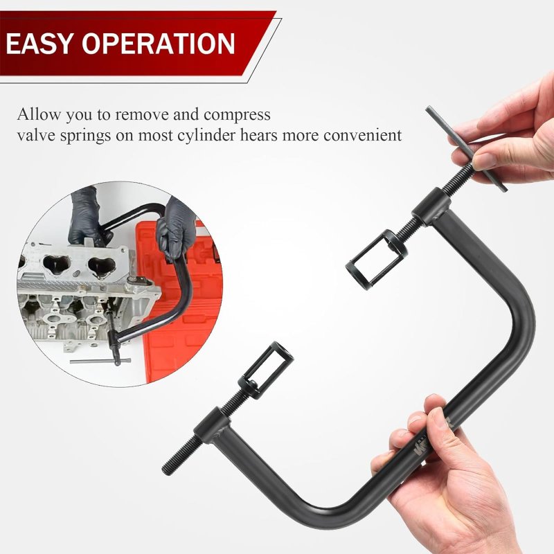Durable Material: Each part is constructed from high-quality metal with a black-oxide finish for maximum strength and longevity that resists rust and corrosion. Valve Removal & Installation: Designed to conveniently install/remove the valve on most cylinder heads by compressing the valve.. C' clamp Jaw: Strong and durable. Using 1.7mm thick Heat Treated steel with black oxide treatment,not easy to bend and deform while compressing. And the two end of the 'C' Clamp are aligned in a standard straight line,Not easy to slip during use.. Various Application: Suitable for your motorcycle, ATV, UTV, car, and other small engine vehicles and equipment; All collets are 1.75 inches (4.4cm) long with 9.5-inch (24.1cm) maximum jaw openings. Easy Storage: This set comes with a heavy-duty plastic blow-molded carrying case for easy transportation, safe storage, and quick organization..Other fine products