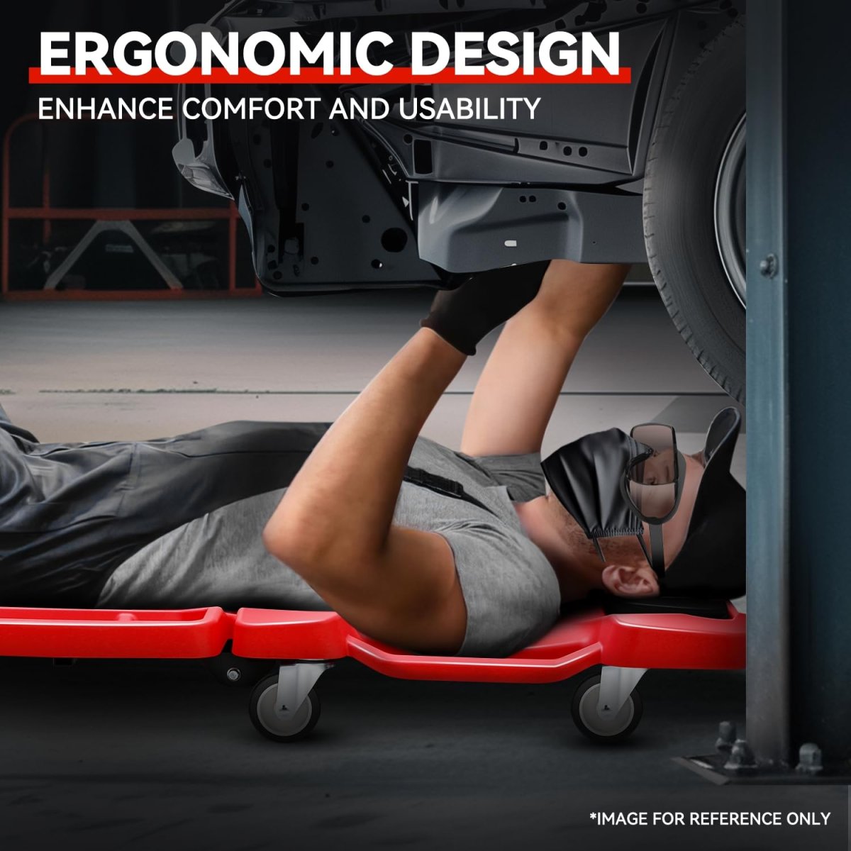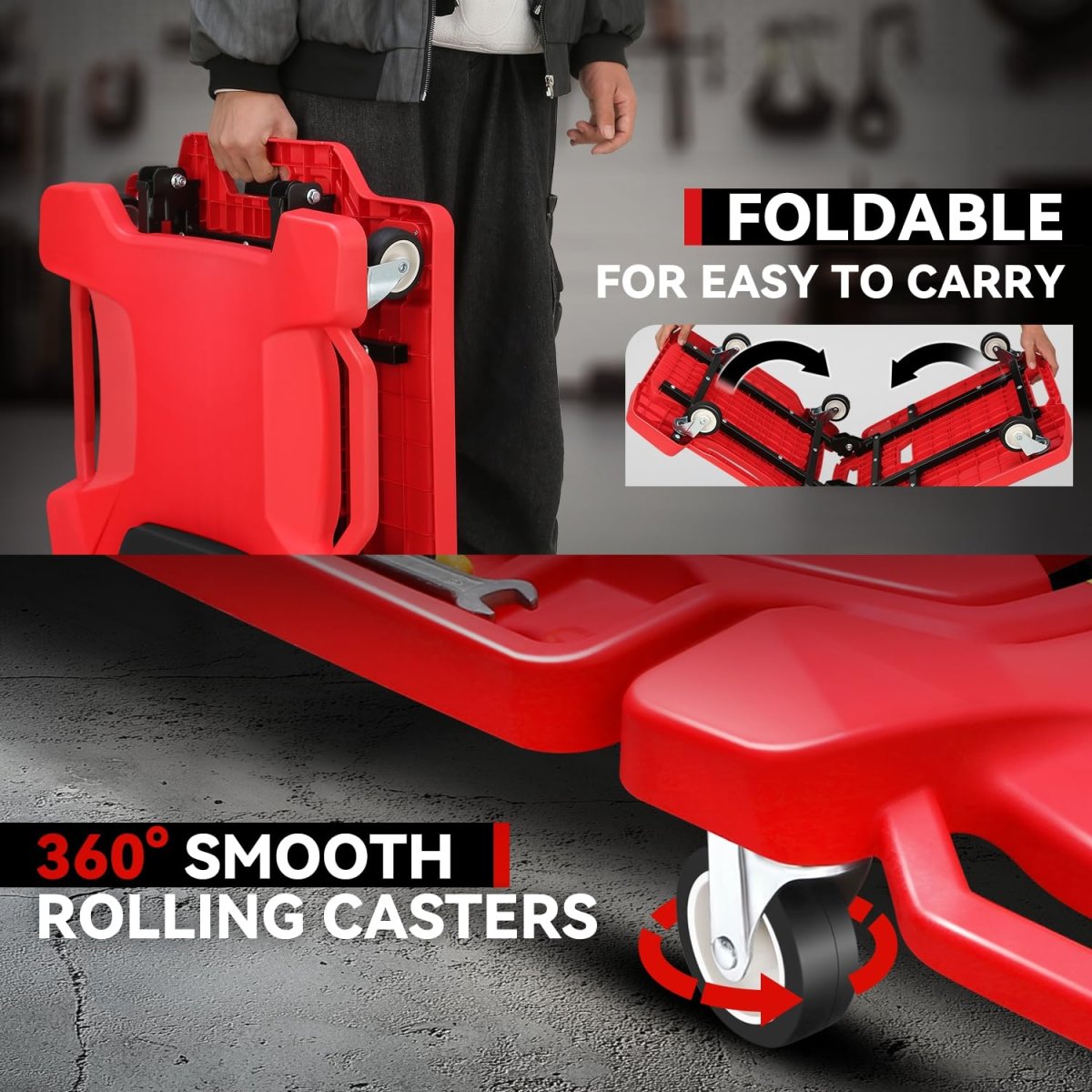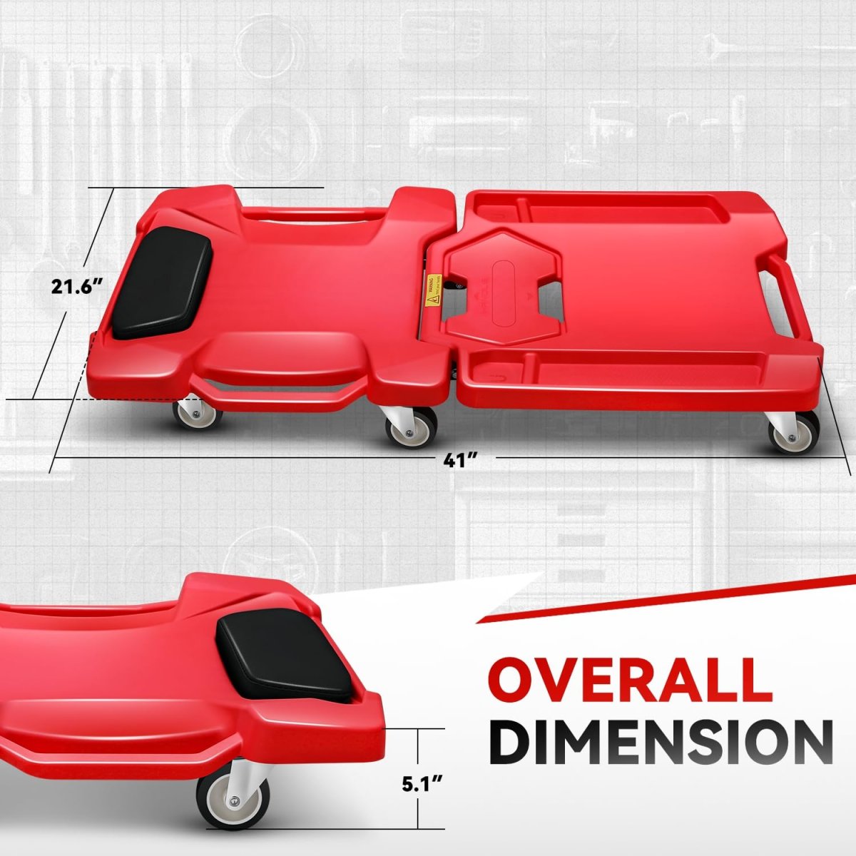 Lightweight: Auto Dynasty Plastic Creeper is a folding blow-molded creeper made from HDPE plastic, which has exceptional strength and durability with its light weight design, and can provide users with extra comfort while lying on it.. 360 Degree Swivel Casters: Our rolling creeper is equipped with six multi-terrain swivel casters, which are industrial strength and provide effortless and smooth movement, ensuring easy maneuverability. 350 LBS Capacity: The Creeper boasts a weight capacity of 350 pounds, complemented by dimensions of 41 inches and 22 inches in width, ensuring comfortable usability for a wide range of users with this ample size.. Ergonomics Design: This Creeper can enhance comfort and usability with its rugged ergonomics design, which can give you more support when sitting slowly on the end of the creeper, and lying back to rest your head on the padded headrest to give you extra relief. Portable Style: This 41 inch low profile creeper can also make it easy to pick up, position, and transport with the bottom-positioned carrying handle, which ensures the work in your garage or workshop with ease..Other fine products