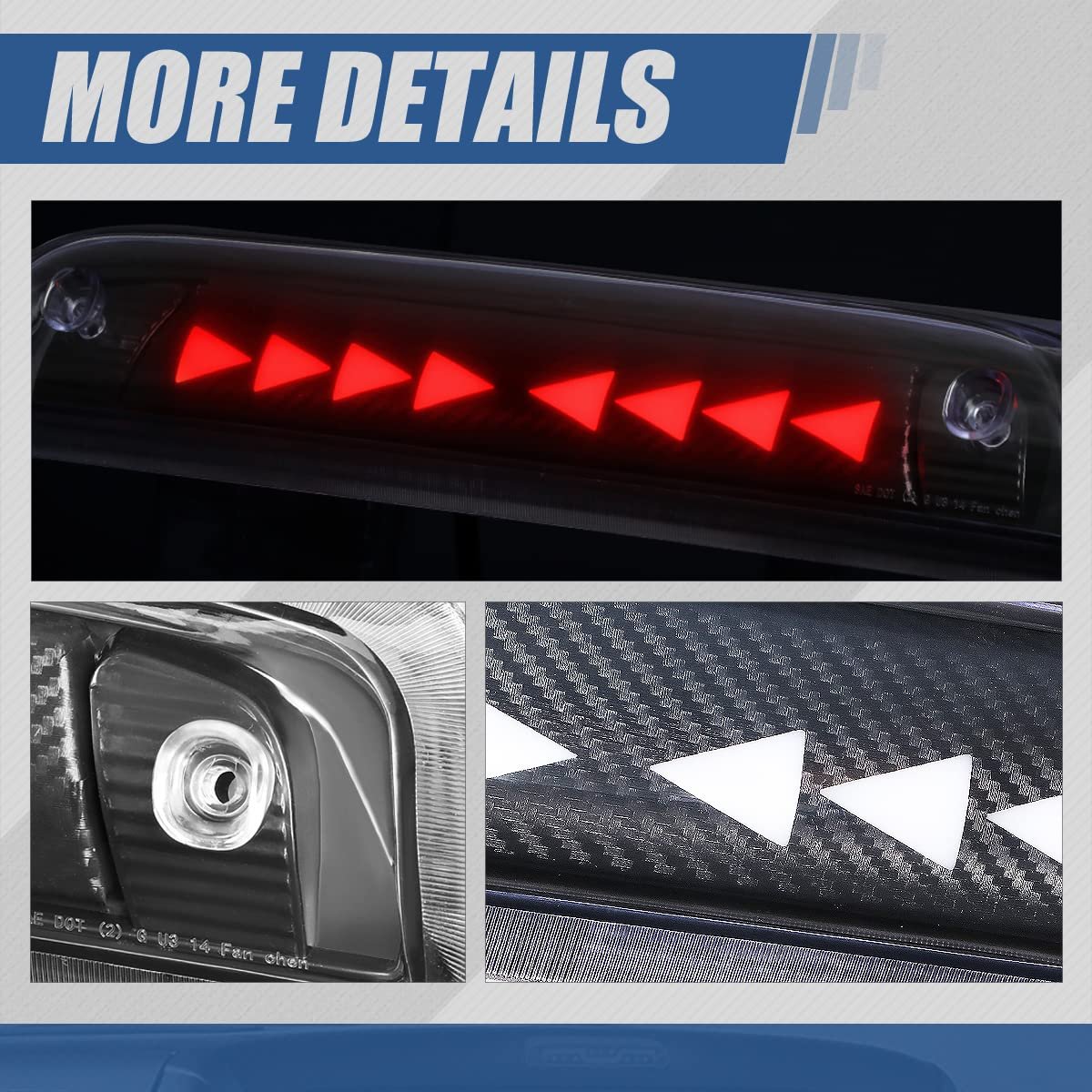 Plug-n-Play Operation, Low Power Consumption; Uses Existing Bolt Holes & Plug for Installation. Super Bright LED lights Compare to the OE Halogen. Simulated Carbon Fiber Design Housing with Clear Lens. 2-Stage Brake Light. Chasing Pattern then Solid Brake Light. Triangle Pattern Light; Deletes Cargo Light Function.Other fine products