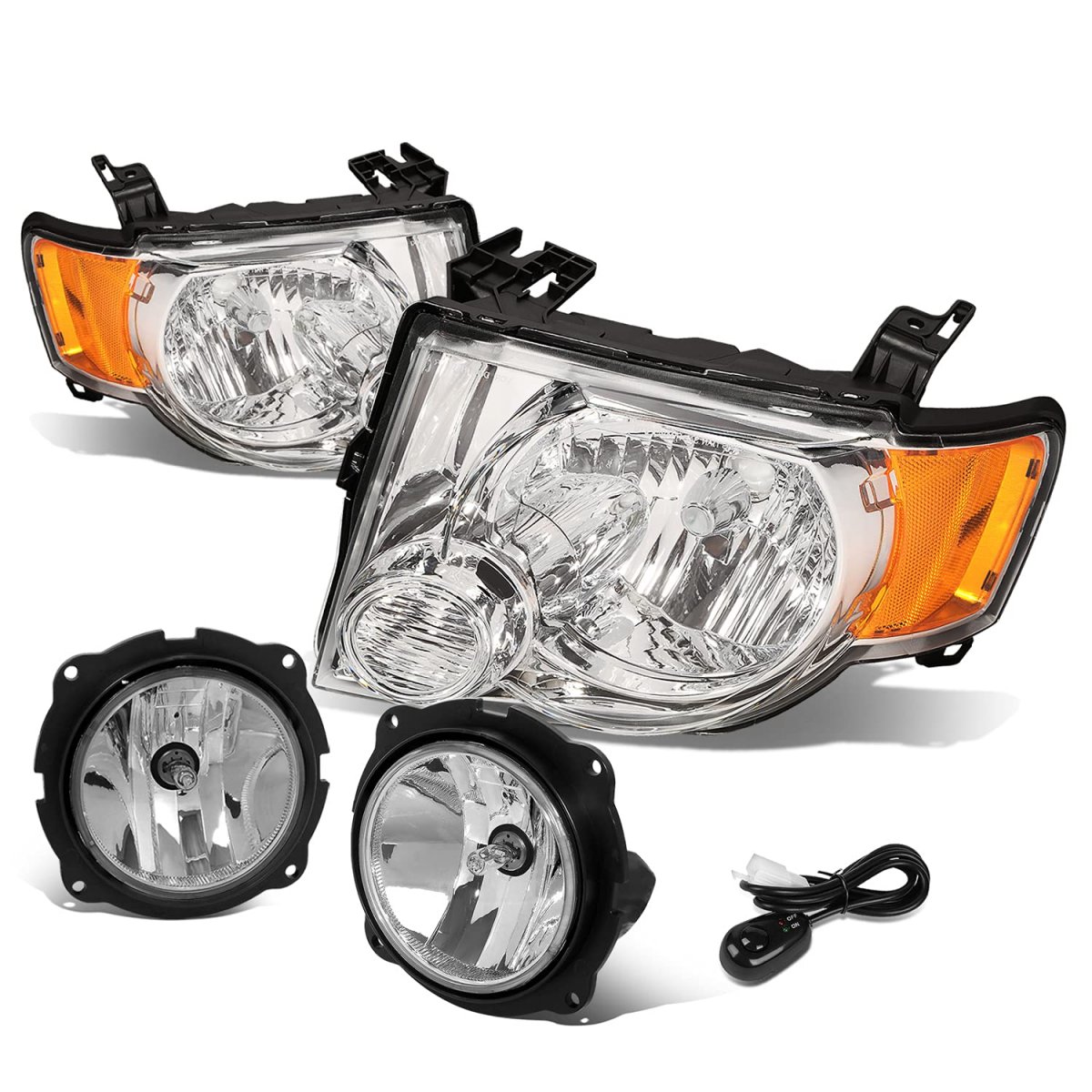 These lights are compatible with Ford Escape 2008-2012.. Come with set of [2] factory style headlights with turn signal, [2] fog lights, [1] fog light switch and harness. It can bring a brilliant appearance to your vehicle or replace old and worn lights.. It is constructed of durable polycarbonate material to ensure a long lasting life in outdoor conditions. Also it can enhance visibility during night time, heavy rain, snow, or dense fog.. Plug-n-play style, direct bolt-on OE fitment and replacement for the factory unit. No need drilling or modification, easily for the installation.. Beam Type: Reflector Bulb Model: H13 High Beam and Low Beam(Not Included) / 5202 Fog(Included) Signal Light: 3457NA Side Marker: 194(Not Included) Housing Color: Chrome Lens Color: Clear OEM Part Number: 8L8Z13008B 8L8Z13008A 7R3Z15200A Parkslink Number: FO2502229 FO2503229 FO2590111.Other fine products