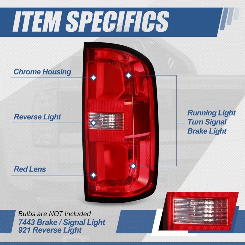 Vehicle Compatibility - Tail lights assembly compatible with Chevy Colorado 2015-2022.. Improve Visibility and Appearance - Come with set of [2] tail lights brake lamp with turn signal, reverse lamp and running light, can replace the old or damaged tail lamp for upgrade appearance of vehicle with a visually striking presence, and help to improve the brightness, allowing you see the road clearly at night or in extreme weather.. Product Specifics - Bulb Type: Halogen Brake / Signal Light: 7443 (Not Included) Reverse Light: 921 (Not Included) Housing Color: Chrome Lens Color: Red, Clear OEM Part Number: 23283790 84169777 94776929 23283791 84169778 94776928 Partslink Number: GM2800270 GM2801270.Other fine products