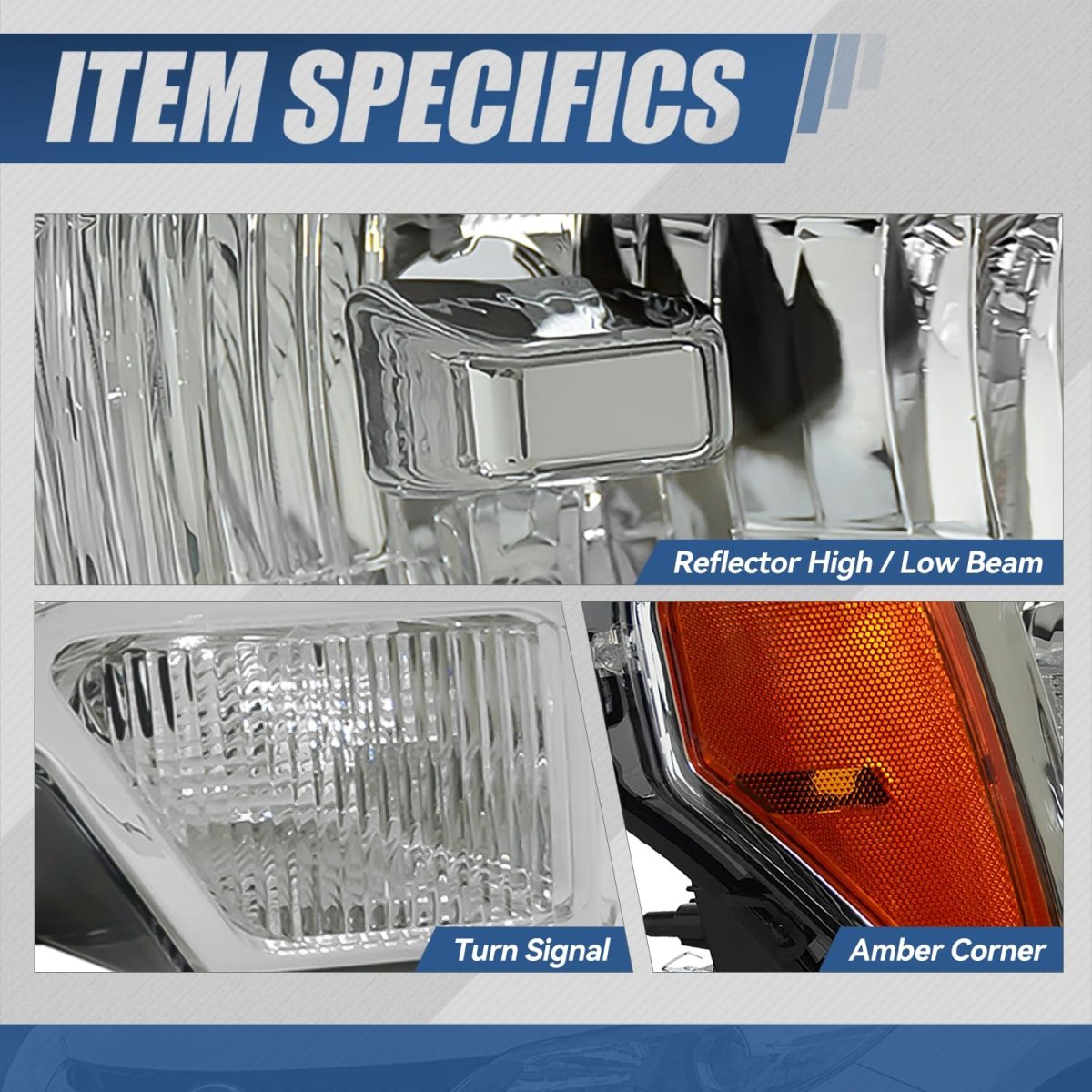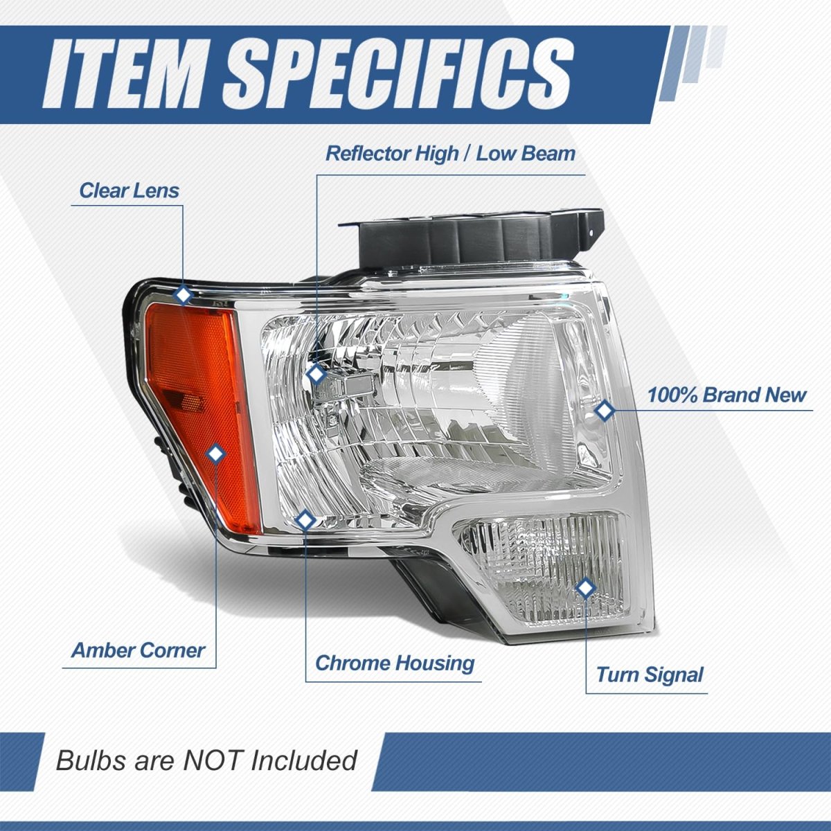 Vehicle Compatibility - Headlight assembly compatible with Ford F-150 2009-2014. NOTES: Fits Halogen Model Only, Does NOT fit Xenon or HID Model.. Best Replacement - Come with [1] right hand (Passenger Side) headlight with turn signal, has been made to exact OEM specifications to ensure the quality and fitment, to refresh appearance of vehicle with a visually striking presence.. Product Specification - Bulb Type: Halogen Beam Type: Reflector High / Low Beam Bulb Model: H13 High / Low Beam (NOT Included) Signal Light: 3157A (NOT Included) Housing Color: Chrome Corner Color: Amber Parkslink Number: FO2503287.Other fine products
