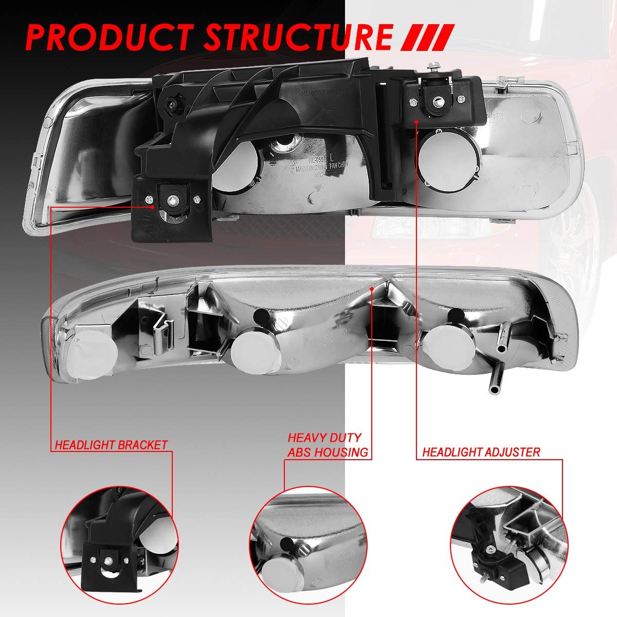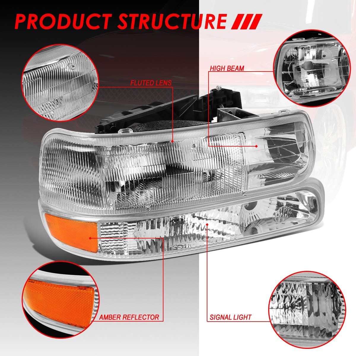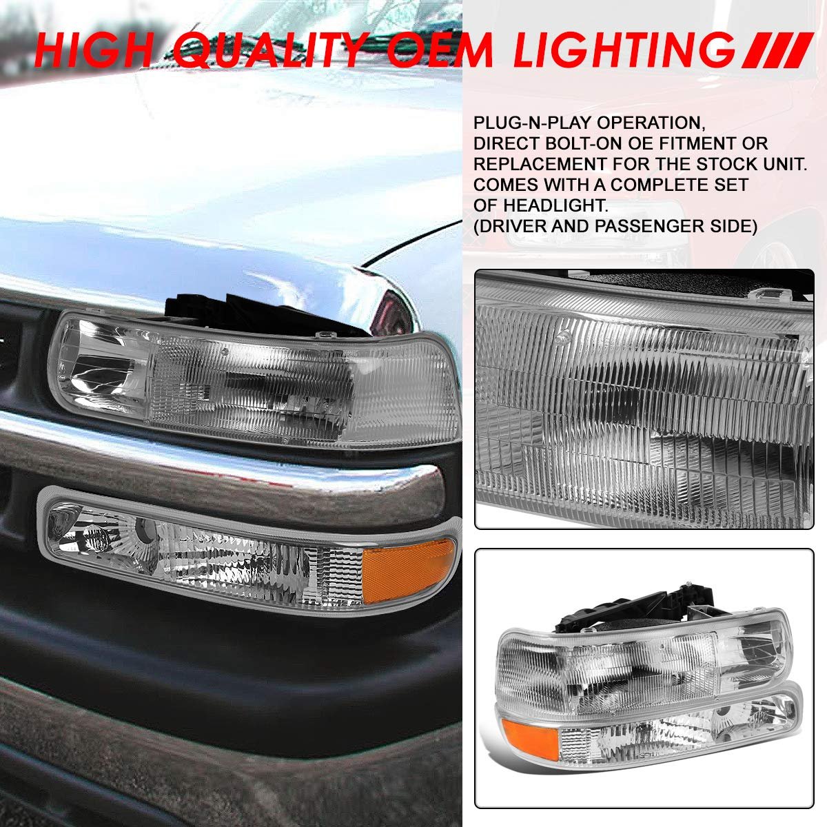 Vehicle Compatibility - Headlights set compatible with Chevrolet Silverado 1500 2500 1999-2002, Chevrolet Silverado 3500 2001-2002, Chevrolet Silverado 1500 HD 2500 HD 2001-2002, Chevrolet Suburban 1500 2500 2000-2006, Chevrolet Suburban Tahoe 2000-2006.. Packing List - Come with 2 x headlights, 2 x bumper lights, 2 X bare black plastic headlight mount brackets. The headlight can replace the old or damaged one for refresh appearance of vehicle with a visually captivating presence.. Product Specfics - Bulb Model: 9005 High / 9006 Low Beam Beam Type: Reflector Lens Color: Clear Lens Housing Color: Chrome OEM Part Number: 15798920 15199559 15199558 16526134 16526133 Partslink Number: GM1221122 GM2521173 GM2520173 GM2503187 GM2502187.Other fine products