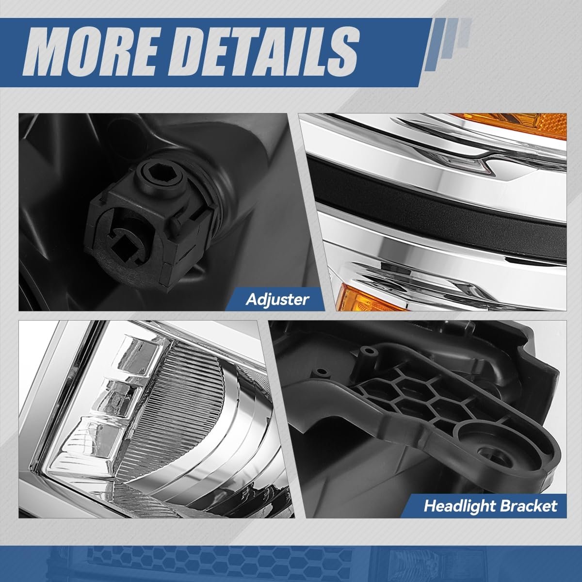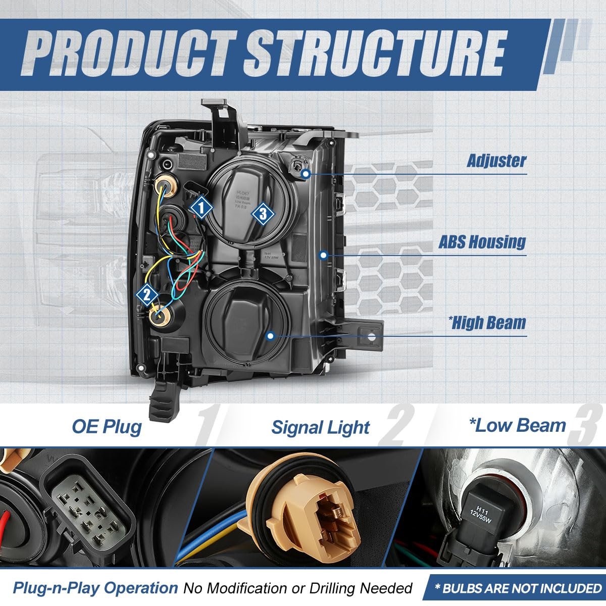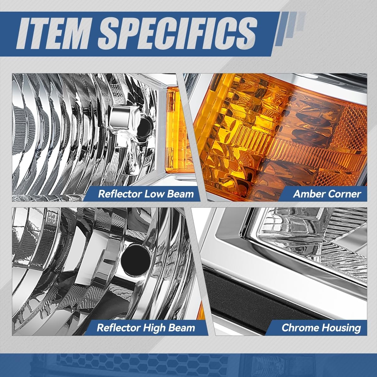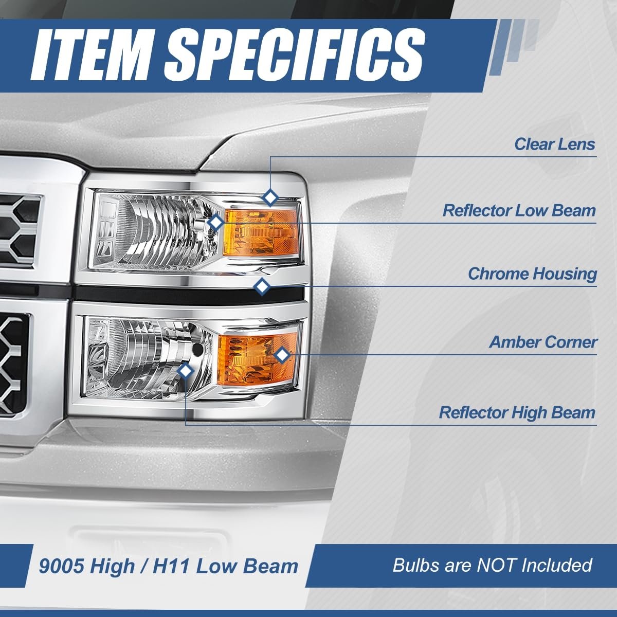 Vehicle Compatibility - Headlight assembly compatible with Chevy Silverado 1500 2014-2015. NOTE: Fits models with reflector headlights Only, does NOT fit projector beam headlight models.. Improve Visibility and Appearance - Come with set of [2] headlights with turn signal (Driver and Passenger Side), can replace the old or damaged headlamp for upgrade appearance of vehicle with a visually striking presence, and help to improve the brightness, allowing you to see the road clearly at night or in extreme weather.. Product Specifics - Bulb Type: Halogen Beam Type: Reflector High / Low Beam Bulb Model: 9005 High / H11 Low Beam (Not Included) Turn Signal / Parking Light: 7443 (Not Included) Housing Color: Chrome Lens Color: Clear Weight: 18 LBS OEM Part Number: 23223255 23380550 23172783 23223256 Partslink Number: GM2503410 GM2502410.Other fine products
