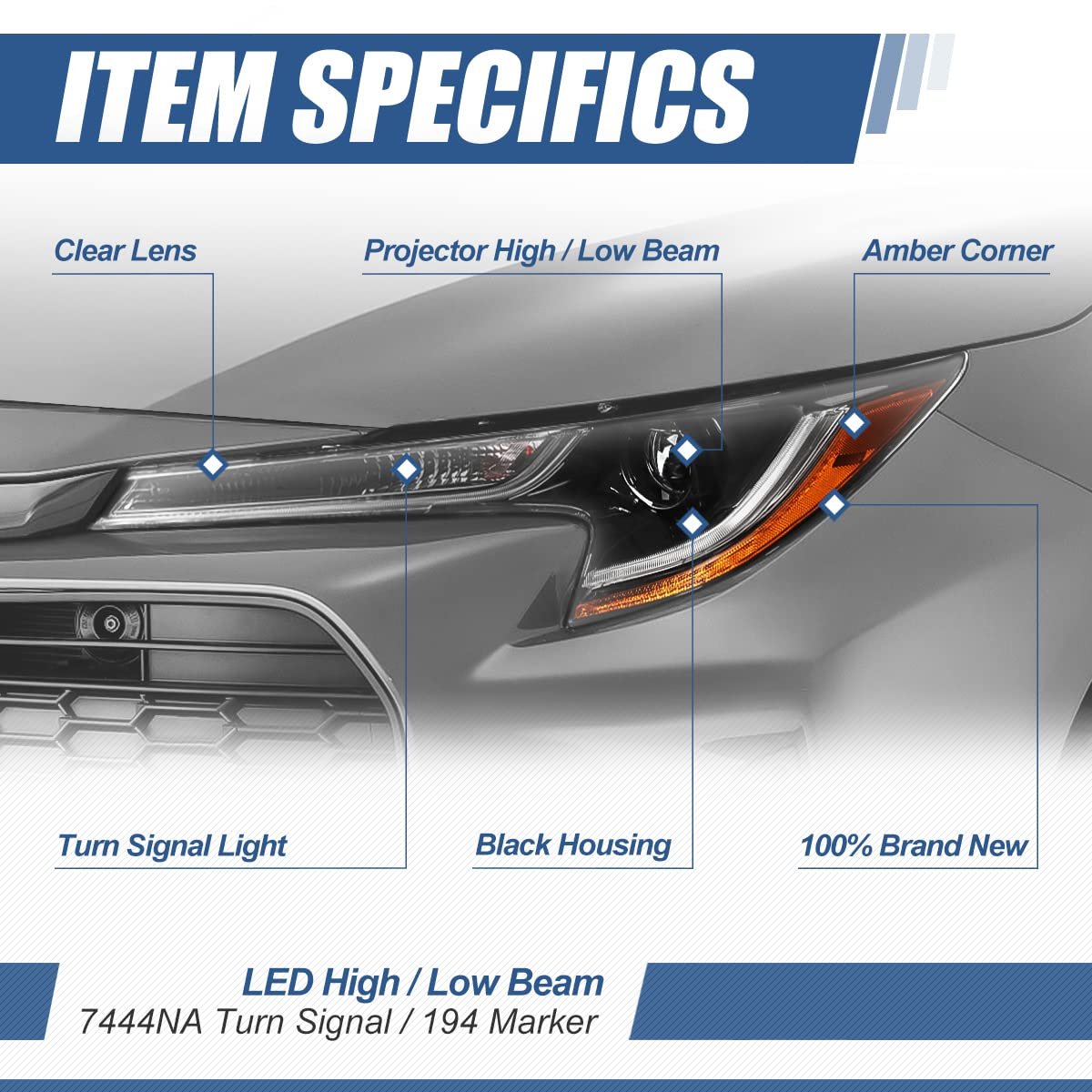 Vehicle Compatibility - This light is compatible with Toyota Corolla Sedan 2020-2024, fits Base/ L/ LE models Only.. Best Replacement - Come with [1] factory style headlight with turn signal (Driver Left Side), can replace the old or damaged one for improve the appearance and lighting of vehicle.. Extraordinary Quality - It is constructed of highly durable polycarbonate material for preventing cracking, waterproof-sealed to keep driving illumination good, can ensure an extremely long lasting operate life in outdoor conditions, including the heavy weather.. Product Specification - Bulb Type: LED Beam Type: Projector High / Low Beam Signal Light: 7444NA (Included) Side Marker: 194 (Included) Housing Color: Black Lens Color: Clear LED Color: White OEM Part Number: 8107012K90 Parkslink Number: TO2518197.Other fine products