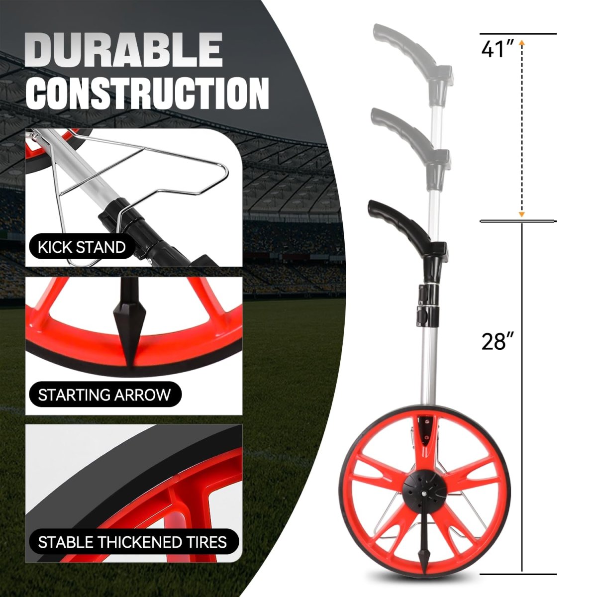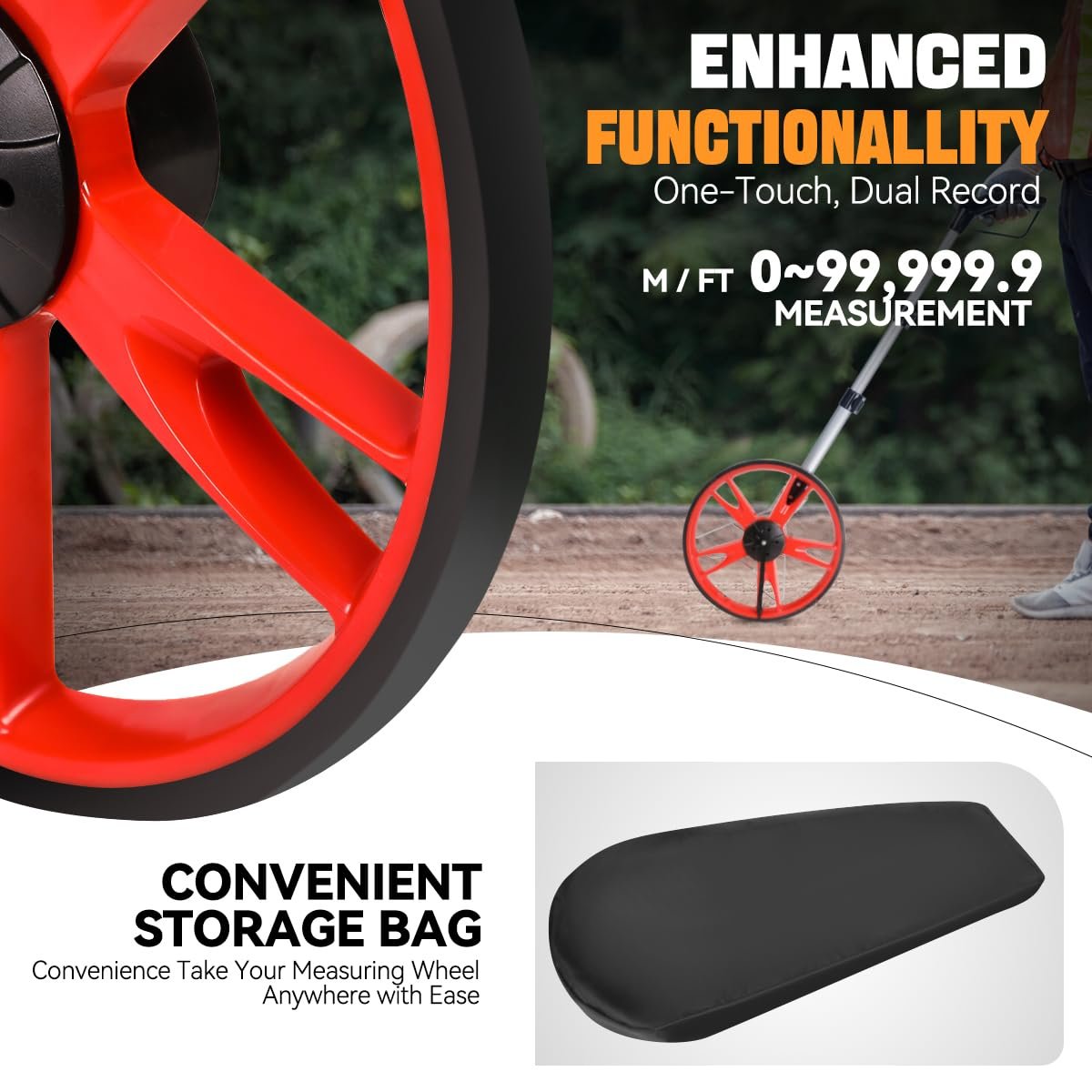 High Precision Measurement: Auto Dynasty precision-designed measuring wheel has accurately measured vast areas like fields and garden with an LED digital display, offering FT, M, SM, and RM units to suit various needs, which can ensure unparalleled accuracy for every job.. Ease of Use: Our measuring wheel can display the measurements clearly by rolling easily, and keep track of your measurement distances anytime(SM). Also, the handle features a large, digital LCD screen with a backlight, providing clear visibility even in dim environments. Portable Style: This telescoping measure wheel has a 3-section foldable design, with the built-in handle extending from 28" to 41" and the foldable convenience kickstand, making it easy to transport and store in the backpack (included).. Memory Functionality: Equipped with 5 buttons in the control center with the backlit display on top-mounted, this measurement wheel can effortlessly hold or clear data with a push-button memory, and also can maximize efficiency with the record up to 99,999.9 meters or feet.. Multiple Applications: The walking measuring wheel can be used in various scenes, which is perfect for landscaping workers, construction workers, and all other measuring professionals, very sufficient for various outdoor projects..Other fine products