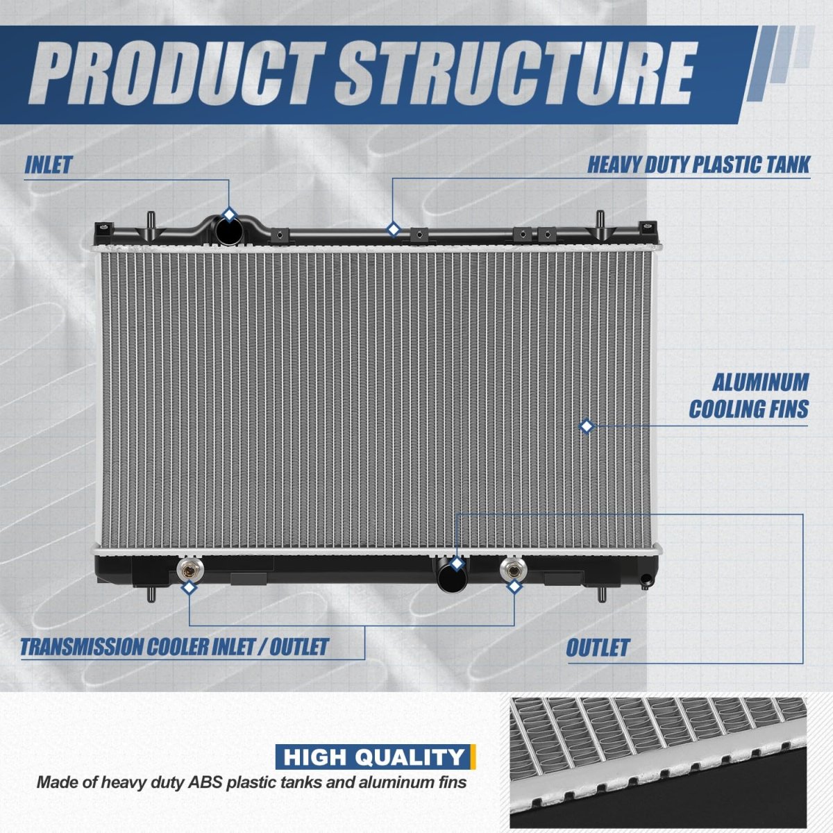 Vehicle Compatibility - Aluminum Core Radiator Replacement Compatible with Dodge Neon 2005, Dodge SX 2.0 2005, Fits 2.0L SOHC Engine. Best Replacement - Come with 1 x 1-Row Radiator can replace the old or damaged one for improved cooling efficiency. Solid Construction Design - Aluminum Core Radiator Replacement made of high-quality ABS Plastic / Aluminum for optimum heat transfer and high-pressure resistance. Easy and Quick to Install - Plug-n-Play Operation, direct bolt-on OE fitment and replacement for the original parts, easy to install without any drilling or modification. Product Specifics - Core Rows: 1 Core Dimensions: 25-1/8" W X 13-11/16" H X 5/8" D Inlet / Outlet Diameter: 1-1/4" Inlet / 1-3/8" Outlet Engine Oil Cooler / EOC: No Transmission Oil Cooler / TOC: Yes OEM Part Number: 5159090AC Partslink Number: 2845.Other fine products