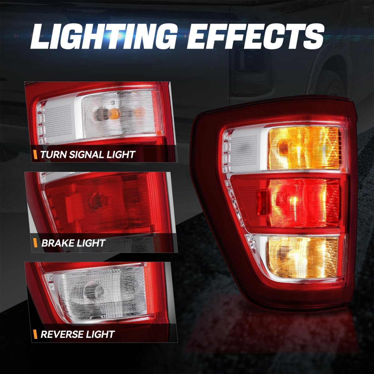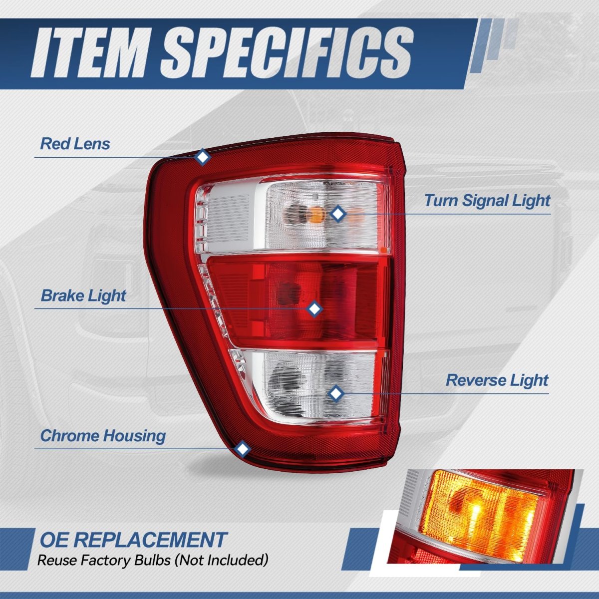 Vehicle Compatibility - Rear Tail Lights Assembly Compatible with Ford F-150 2021-2023, Fits XL, XLT Models with Factory Halogen Tail lights without Blind Spot Detection. Best Replacement - Come with 1 x taillight assembly(Left) can replace the old or damaged one for upgrade appearance of vehicle with a visually striking presence and great longevity. Product Specfics - Lighting Technology: Halogen Bulb Model: WT21W Reverse, Brake, 4257NA Turn Signal Lens Color: Red / Clear Housing Color: Chrome OEM Part Number: FO2800281.Other fine products