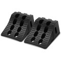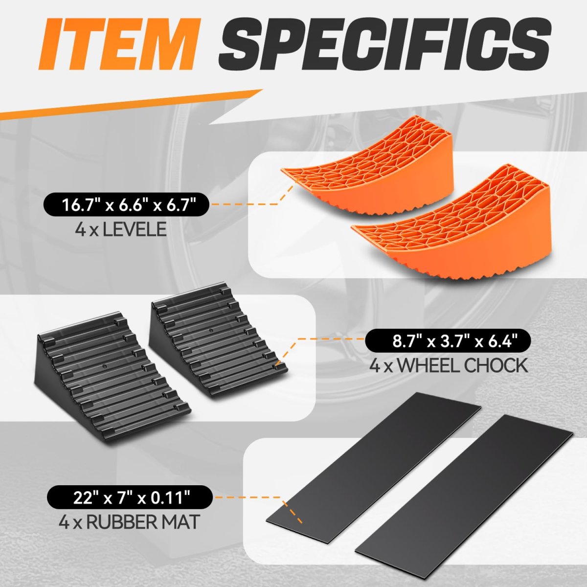 Precise & Swift LevelingEffortlessly achieve perfect leveling within 5 minutes, adjusting your trailer by increments from 1/2" to 4". Say goodbye to the hassle of using blocks or planks; simply drive onto our levelers until your RV, camper, or trailer is level it's that simple.. Universal Fit for Dual Axle TrailersDesigned with moderate dimensions, our levelers seamlessly fit most dual axle trailers without the need for trimming or modifications. Enjoy hassle-free leveling that beats out other devices requiring customization.. Heavy-Duty Load-Bearing CapacityCrafted from a high-performance polymer, our RV levelers boast a lifetime durability. Capable of supporting trailers up to 27,000 lbs, they resist breaking or compressing under weight, unlike levelers made of HDPE or PP. A vital safety assurance for your RV.. Product SpecificationLeveler: 16.7" x 6.6" x 6.7" Wheel Chock: 8.7" x 3.7" x 6.4" Rubber Mat: 22" x 7" x 0.11".Other fine products
