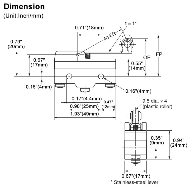 Product Name : Limit Switch;Material(External) : Resin, Metal;Color : Black, Silver Tone. Rating & Voltage : AC125/250V, 15/20A,DC125/250V, 0.6A/0.3A;Contact Configuration : 1NO, 1NC(SPDT);Actuator Action : Momentary. Actuator Type : One-way Roller Lever;Termination Type : Screw Terminal;Two Fixing Hole Distance : 2.5cm /1. Fixing Hole Diameter : 0.4cm / 0.16. Switch Size : 4.9x 1.7 x 3 cm / 1.9.Other fine products