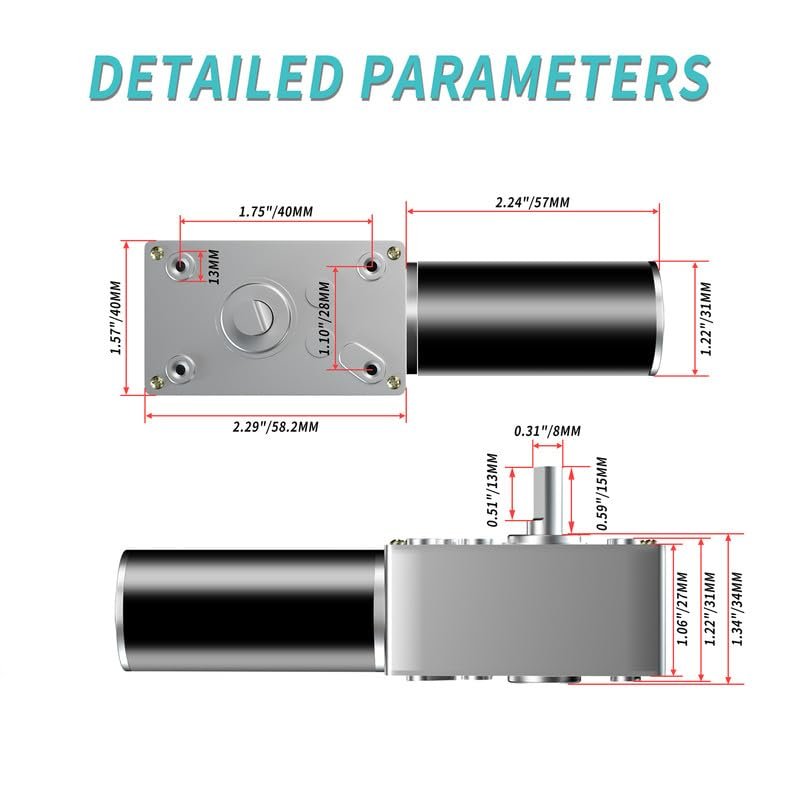 Rated voltage: DC24V; No-load speed: 120RPM; Rated speed: 96RPM; Rated torque: 4kg.cm; the output shaft can't rotation when power-off, that is the Turbo worm geared motor with self-lock; Package: 1Pcs x DC Worm Gear Motor;. DC Motor Body Dimensions: 31 x 57mm/ 1.22" x 2.24"(D*L); Gear Box Dimensions: 58.1 x 40.1 x 35mm/ 2.28"x1.57"x1.37"(L*W*H), Output Shaft Dimensions: 8 x 15mm/ 0.31" x 0.59"(D*L) with 1x 13mm/ 0.039*0.51(H*L) flat cut off; Wire Length: 19mm/7.13";. You can change the wiring-connection to change shaft rotation direction, the reducer output shaft arranged vertically with the motor shaft, whole motor output is relatively short,can be widely used in various of occasions that require special installation size;. Double ball bearings effectively reduce friction between bearing surfaces, improve mechanical power transmission efficiency and lifespan; Using metal materials with good impact resistance, durability, and ultra-low noise to create a durable and long-lasting gearbox;. How to choose the torque: if driven by a pulley, the radius of the pulley is 1cm, the pulling force of the belt is 25kg; if the radius of the pulley is 2cm; the pulling force of the belt is 12.5kg, and so on; and transmission efficiency and grinding coefficient must be considered in combination with the actual situation;.Other fine products