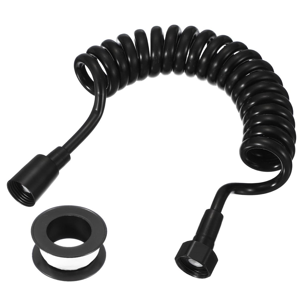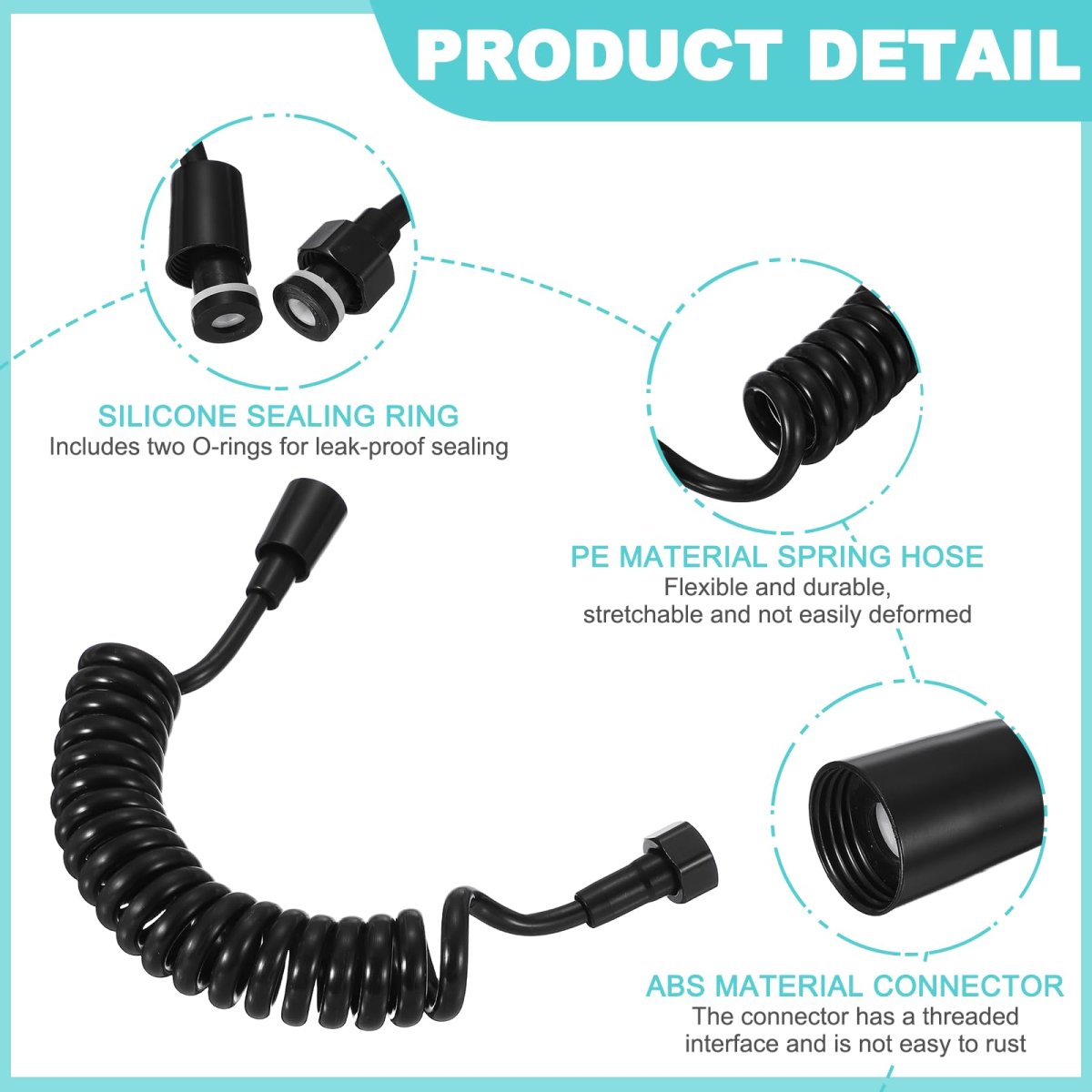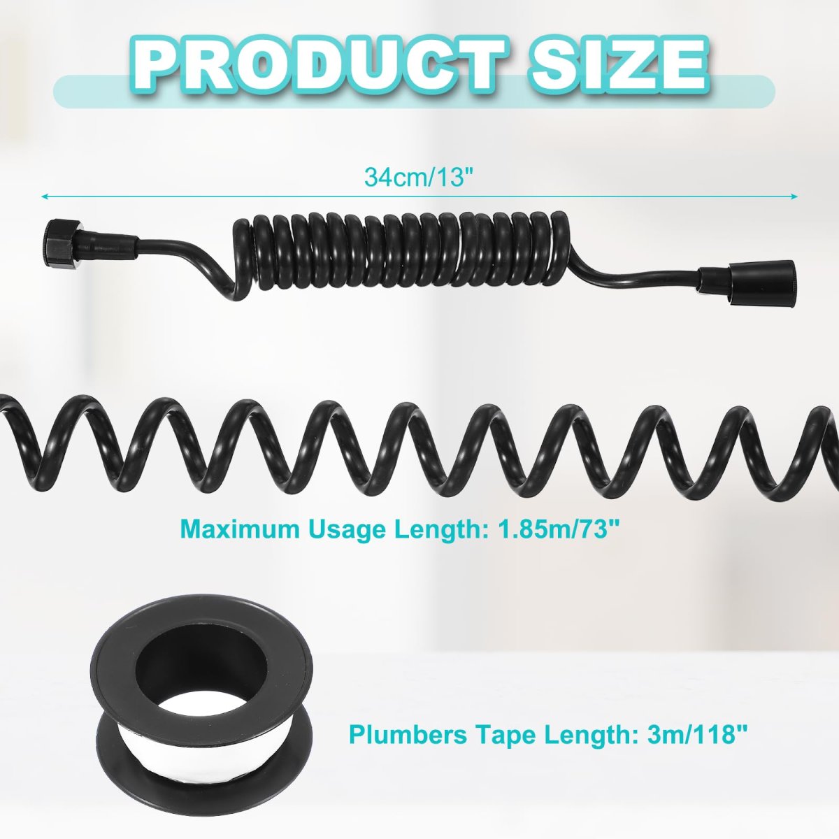 Specifications: Color: Black; Material: PE and ABS; Hose Retracted Length: 34cm/13"; Hose Extended Length: 1.85m/73"; Plumbers Tape Length: 3m/118"; Thread specifications: Standard G1/2"; Package Content: 1 Bidet Shower Hose with 1 Plumbers Tape. Material: Made with a PE tube and reinforced with ABS connectors. The universal G1/2 thread (0.8 inches) of this telescopic spring tube hose fits most standard bathroom accessories, and the built-in sealing ring helps prevent leaks. The included plumbers tape further helps secure connections.. Function: This bidet hose is a telescopic spring tube design, crafted for enhanced bathroom functionality. It offers flexible, anti-twist performance and stretches to meet a wide range of versatile cleaning needs. It not only withstands typical water temperatures and pressures but also provides consistent flow for bidet sprayers, faucets, and handheld showers.. Easy to use: Installation is simple and tool-free. All you need to do is wrap the included plumbers tape around the G1/2 thread connections, then hand-tighten the bidet hose to your bidet sprayer, faucet, or shower outlet until secure to prevent leaks.. Multiple Use: Our shower tube resists winding and knots, retracting smoothly after use. Its compact storage and expandable reach make it suitable for various spaces. Suitable for toilet bidet sprayers, bathroom faucets, handheld showers, pet washing, and plant watering..Other fine products