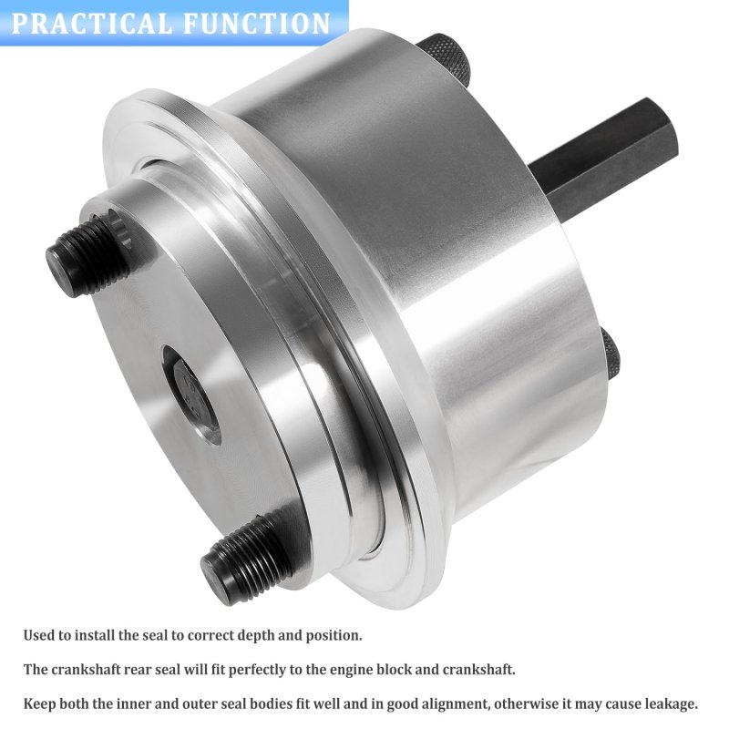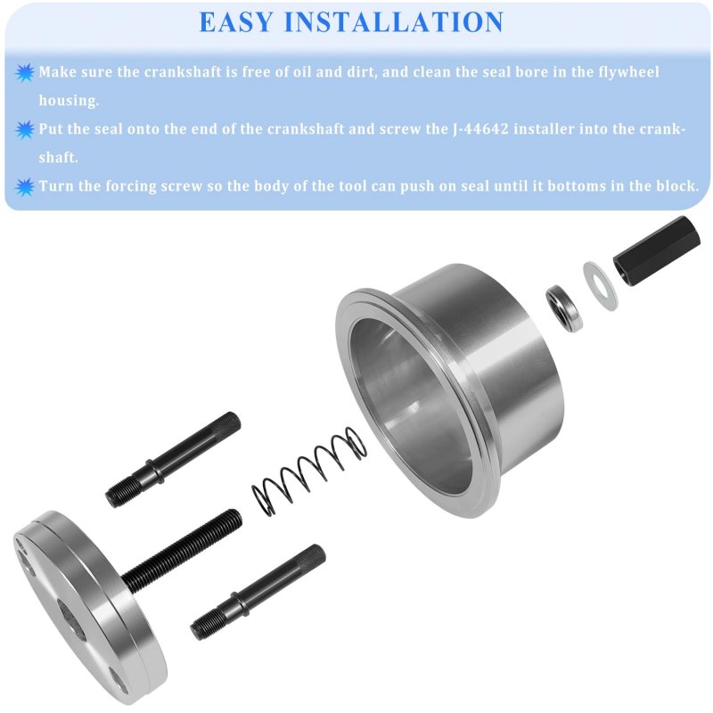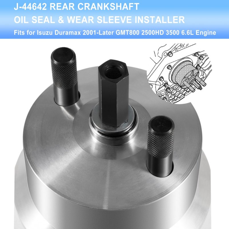 Great Compatibility This tool is specifically designed for Isuzu 6.6L Duramax 2001-Later GMT800, 2500HD, 3500 with 6.6 liter Duramax diesel engines.. Practical Function This tool is used to install the seal to correct depth and position. The crankshaft rear seal will fit perfectly to the engine block and crankshaft. It is of vital importance to keep both the inner and outer seal bodies fit well and in good alignment, otherwise it may cause leakage.. Easy Installation Make sure the crankshaft is free of oil and dirt, and then clean the seal bore in the flywheel housing. Put the seal onto the end of the crankshaft and also screw the J-44642 installer into the crankshaft. Turn the forcing screw so the body of the tool can push on seal until it bottoms in the block.. Direct Replacement This tool is alternative to J-44642 rear crankshaft oil seal and wear sleeve installer.. Superior Construction The tool set is made of premium steel to prevent corrosion and rust, sturdy and wear resistant for providing excellent performance and lasting service time..Other fine products