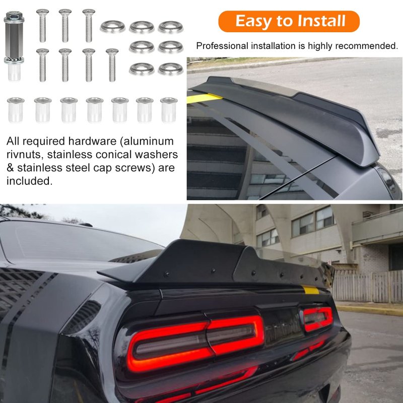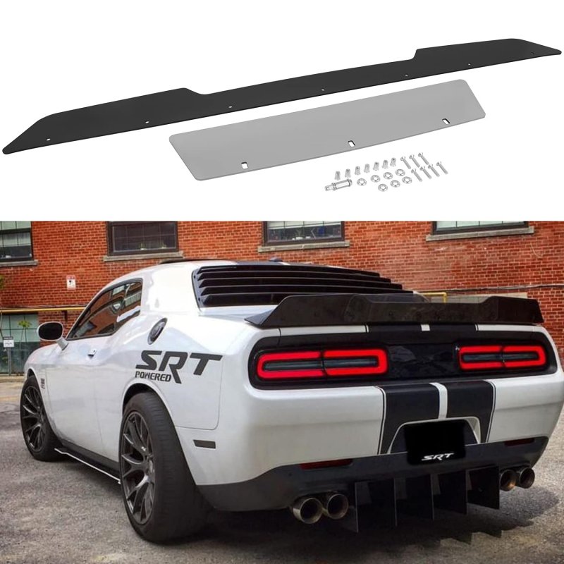 Perfect Fitment This rear wickerbill spoiler is compatible with Dodge Challenger 2008 2009 2010 2011 2012 2013 2014 SRT RT SXT SE with stock factory spoiler. Highly accurate model designs to ensure exact fitment. Will NOT fit Challenger with Back up camera.. Durable Construction Machined from premium light weight ABS material while finished with delicate gloss black, higher strength and better abrasion resistance. Provide you with long-lasting service and add appealing decoration on your beloved car.. Safe Design for Driving Spoiler design provides downward pressure on the car, which will offset some lift so your car can grip the road better and keep stable while driving at high speed. Enjoy secured and steady driving with this lightweight, decorative wickerbill spoiler..Other fine products