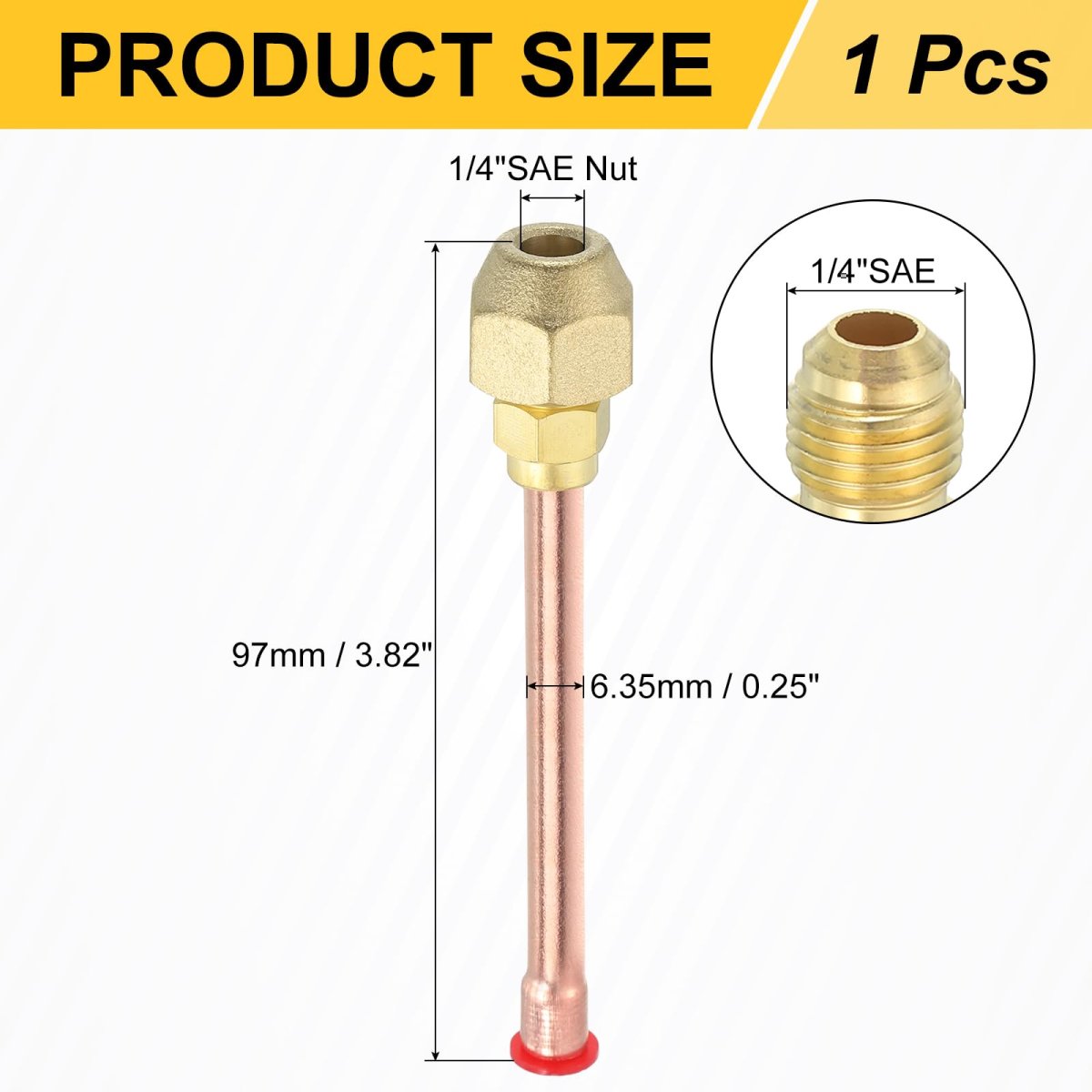 [SIZE&PACKAGE]: Male Thread Size: 1/4"SAE; Tube Outer Diameter: 6.35mm/0.25"; Overall Length: 97mm/3.82"; Package: 1Pcs x Pipe Fitting with 1Pcs x 1/4"SAE Nut. [MATERIAL]: The pipe fittings are made of brass, which has high strength, is not easy to break, has strong wear resistance, corrosion resistance, heat resistance, high low-temperature strength, good mechanical properties, and long service life. The pipes of the connecting pipes are made of copper, which has good ductility and metallic luster. [DESIGN]: HVAC pipe fittings are composed of nuts, threaded fittings, and copper pipes. After the nuts are tightened, they have good sealing properties and can prevent gas and liquid leakage; the threaded joint is connected to one end of the copper pipe and has a hexagonal thread, which enhances the leverage and is not easy to slip when using a wrench. [HOW TO USE]: Copper pipe fittings are easy to use and install. The pipe has a flared end, which is convenient for connecting other pipes during welding. Flare connectors can be easily connected to various refrigeration systems by welding. [WIDE APPLICATION]: Pipe fittings are widely used in pipe replacement and sealing of various refrigeration systems, such as refrigerators, air conditioners, chiller lorry, freezers, and other objects with refrigeration systems.Other fine products