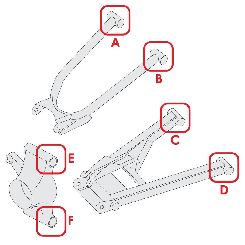 Order Includes: 2 x Long Pivot Shaft, 4 x Short Bushing. Compatible with Polaris models: Ranger 570 2014-2023. Note: Installs On Location (F) In Second Picture.. Part Number: Long Pivot Shaft: 5138796, Short Bushing: 5439874, 5436832, 5436505. We strongly suggest comparing the posted picture to the unit(s) that needs to be replaced..Other fine products