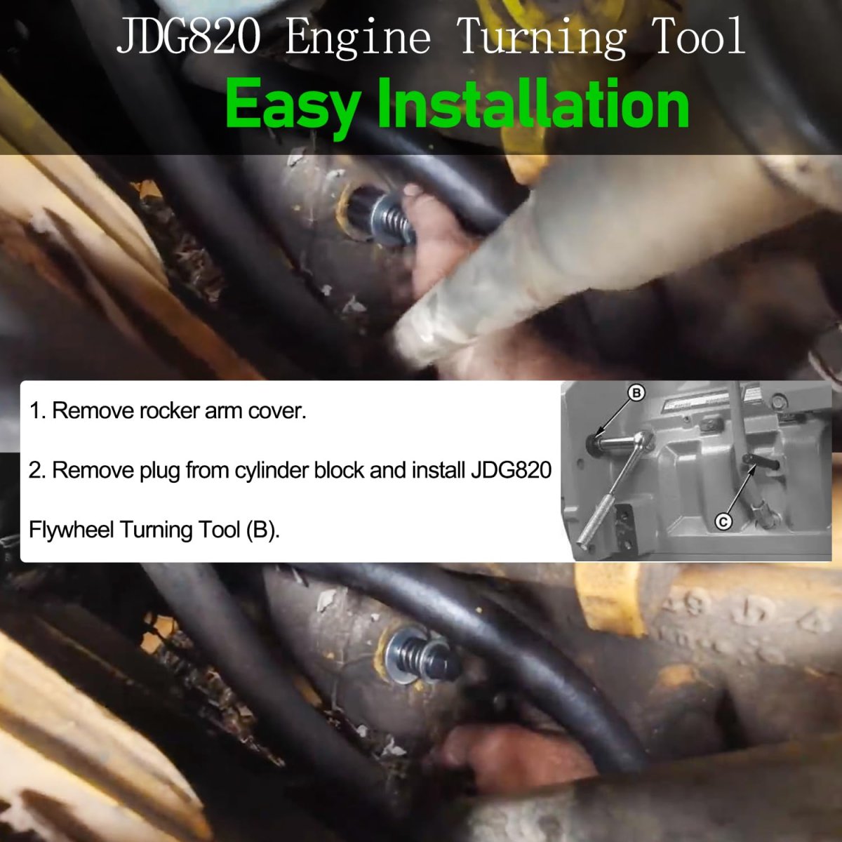 APPLICATION -- Work for John Deere 4024, 4039, 4045, 4239, 4276, 6619, 6059, 6068, 6076, 6081, 6090, 6105, 6125, 6135, 7400 and 7600 Tractors. Suitable for engines with 129-tooth flywheel ring gear and a 29.9 mm (1.18 in.) flywheel housing guide bore diameter.. DIRECT REPLACEMENT -- Alternative to OEM JDG820, formerly JDE81-1. The JDG820 may be used if JDE81-1 is not available.. FUNCTION -- Used to rotate engine flywheel: To lock engine at "TDC" to check high pressure fuel pump timing. To check damper radial runout and piston protrusion. To check camshaft-to-crankshaft timing. JDG820 Flywheel Turning Tool must be used for 6.8L engines in 7400 and 7600 Tractors.. EASY INSTALLATION -- Slid the cover out and install the flywheel turning tool. Insert the timing pin (not includes) into the timing mark. Attached a socket to the turning Tool and turn the crankshaft wheel until the timing pin is engaged by the pin socket. This will ensure the engine is in the correct timing position.. -- Manufactured from quality steel, using top of the line machining and measuring equipment to ensure each part is manufactured to OEM quality standards and specifications. Improved its strength, durability and ensure high performance..Other fine products