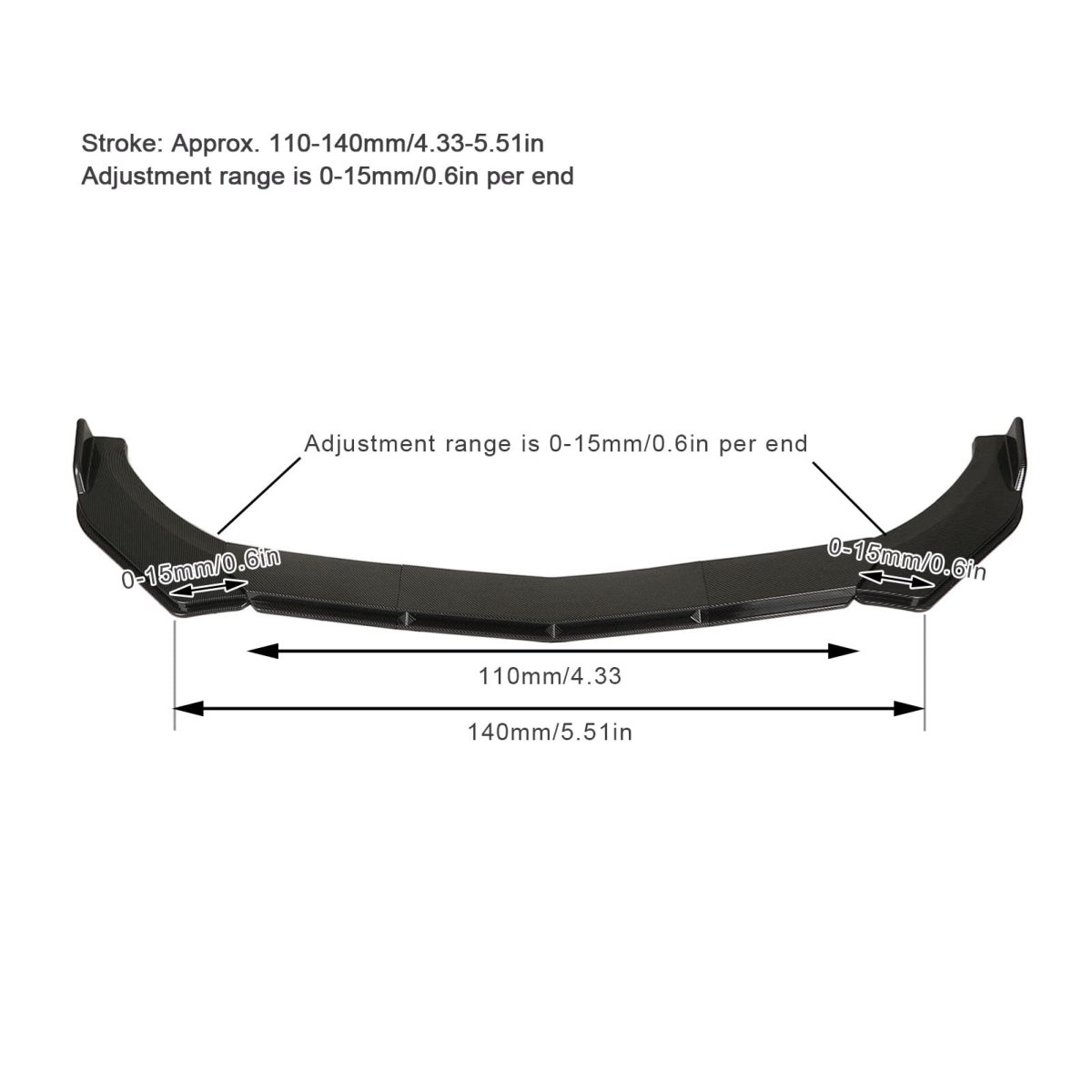 Compatibility: Front bumper spoiler is compatible with Seat , compatible with , compatible with Accord, compatible with Civci, compatible with Corolla.. : Made of ABS plastic, high hardness, strong impact resistance, wear resistance, good toughness, not easy to deformation, ensure long time use.. Enhanced appearance: Exquisitely crafted, the front bumper splitter lip has an elegant and personalized appearance that can upgrade your vehicle, enhance the visual effect and upgrade the bodywork.. Protective function: The front bumper spoiler can reduce wind resistance, prevent collision and the bumper from road bumps and scratches.. Size: Stroke is about 110-140mm / 4.33-5.51in, adjustable size is about 0-30mm / 0-1.2in..Other fine products