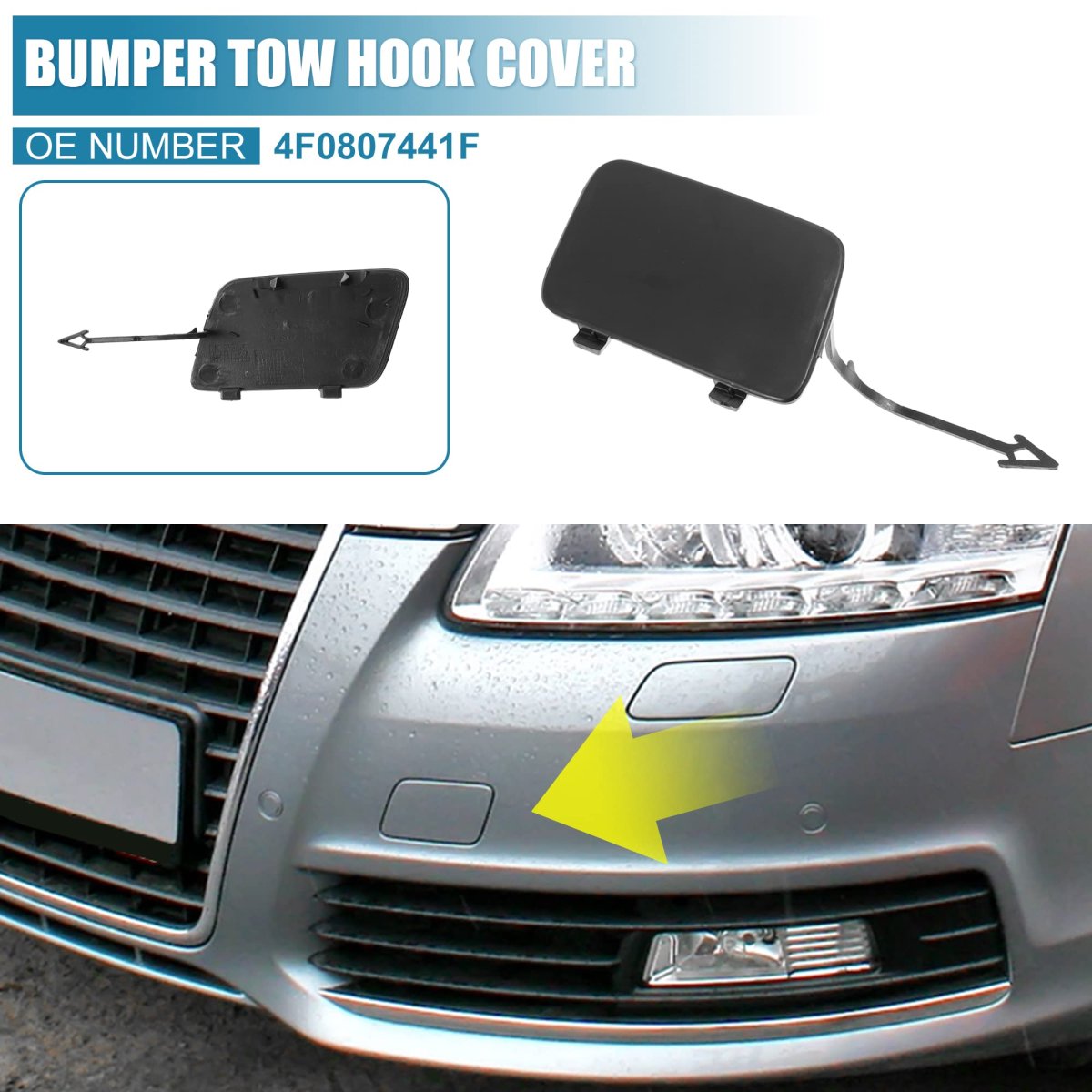 Front towing eye cover cap fits for Audi A6 3.0L V6 A/T Quattro Avant Wagon 2009 2010, for Audi A6 3.0L V6 A/T Quattro Base Sedan 2009 2010, for Audi A6 4.2L V8 A/T Quattro Base Sedan 2009 201017. Placement on Vehicle: Front, Right.. Durable Material: Made of plastic material, waterproof, corrosion-resistant, and long service life. It is stable characteristics for use.. Easy Installation: The front tow hook cover cap is with the installation clip, and you can install it on the car's front hood easily.. Nice Replacement: It is a good replacement for the old or broken one. Match for the original one for the car..Other fine products
