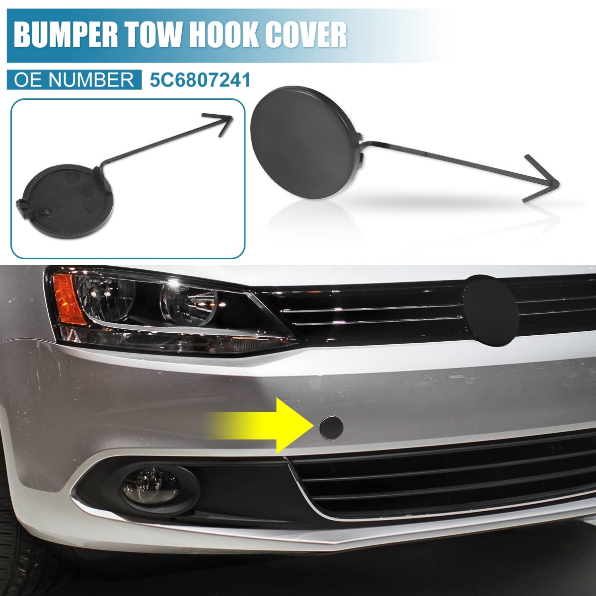 Front towing eye cover cap fits for Volkswagen Jetta 2011-2014. Placement on Vehicle: Front. Durable Material: Made of plastic material, waterproof, corrosion-resistant, and long service life. It is stable characteristics for use.. Easy Installation: The front tow hook cover cap is with the installation clip, and you can install it on the car's front hood easily.. Nice Replacement: It is a good replacement for the old or broken one. Match for the original one for the car..