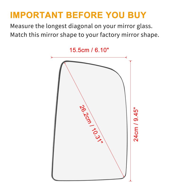 Replacement of mirror glass for Mercedes-Benz Sprinter 2500 2010-2018, for Mercedes-Benz Sprinter 3500 2010-2018. Features: Right side mirror glass with backing plate. Heated mirror for quicker defrost. Without auto dimming.. Easy to install for replacing the damaged mirror.. Package Includes: 1 x Mirror Glass (Right Side).Other fine products