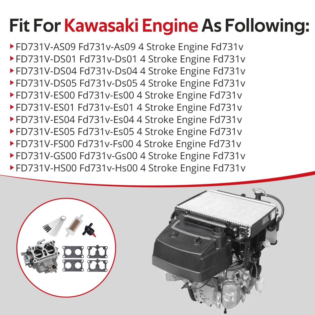 FitmentFit For Kawasaki Engine As Following: FD731V-AS09 Fd731v-As09 4 Stroke Engine Fd731v;FD731V-DS01 Fd731v-Ds01 4 Stroke Engine Fd731v;FD731V-DS04 Fd731v-Ds04 4 Stroke Engine Fd731v; FD731V-DS05 Fd731v-Ds05 4 Stroke Engine Fd731v; FD731V-ES00 Fd731v-Es00 4 Stroke Engine Fd731v; FD731V-ES01 Fd731v-Es01 4 Stroke Engine Fd731v;FD731V-ES04 Fd731v-Es04 4 Stroke Engine Fd731v. Fitment: FD731V-ES05 Fd731v-Es05 4 Stroke Engine Fd731v; FD731V-FS00 Fd731v-Fs00 4 Stroke Engine Fd731v;FD731V-GS00 Fd731v-Gs00 4 Stroke Engine Fd731v; FD731V-HS00 Fd731v-Hs00 4 Stroke Engine Fd731v. O.E.M# 15003-2974 15004-2063 P226C. Package: Carburetor Carb Kit x1.Other fine products