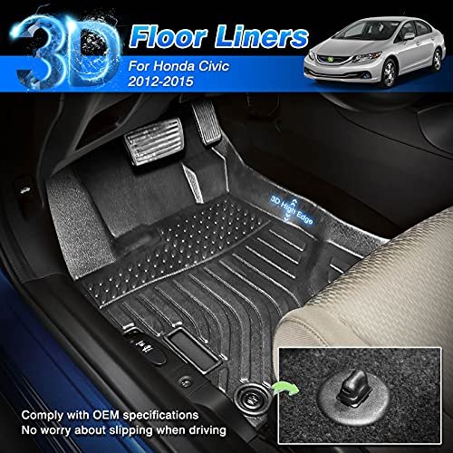 Accessories for Honda CivicCustom fit for 2012 2013 2014 2015 Honda Civic (Not fit for 2 Doors Couple). Precisely 3D scanning design allows them to 100% match the contours of your vehicle. No trimming is required.. Premium MaterialThe Civic floor mats are made of TPE materials, strong flexibility, soft-touch, non-deforming, easy to recover, non-toxic and odorless.. High Edge ProtectionRaised edges all the way round give more protection to your vehicles carpet floor by catching spills, stains, dirt and debris. Make sure the mess stays on the liner and off your original clean carpet.. All Weather GuardThe Civic floor mats feature -40F to 122F temperature resistance. Larger coverage design can trap sand, water, mud, dirt, rain, muck. Protect your vehicle floor from any other messy accidents.. Super Easy to CleanThe Civic floor mats can be simply rinsed with water. Quick and easy to make your car floor look nice and new again!.Other fine products